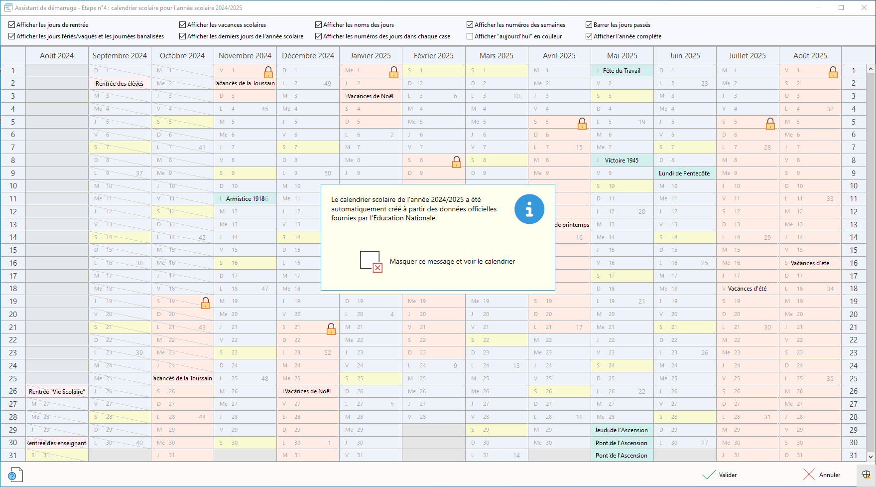 l'Assistant de démarrage permet de récupérer automatiquement ou de créer manuellement le calendrier scolaire de l'année.