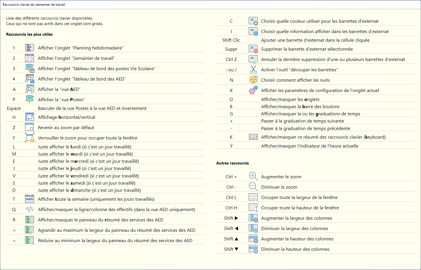 Raccourcis clavier pour le semainier de travail