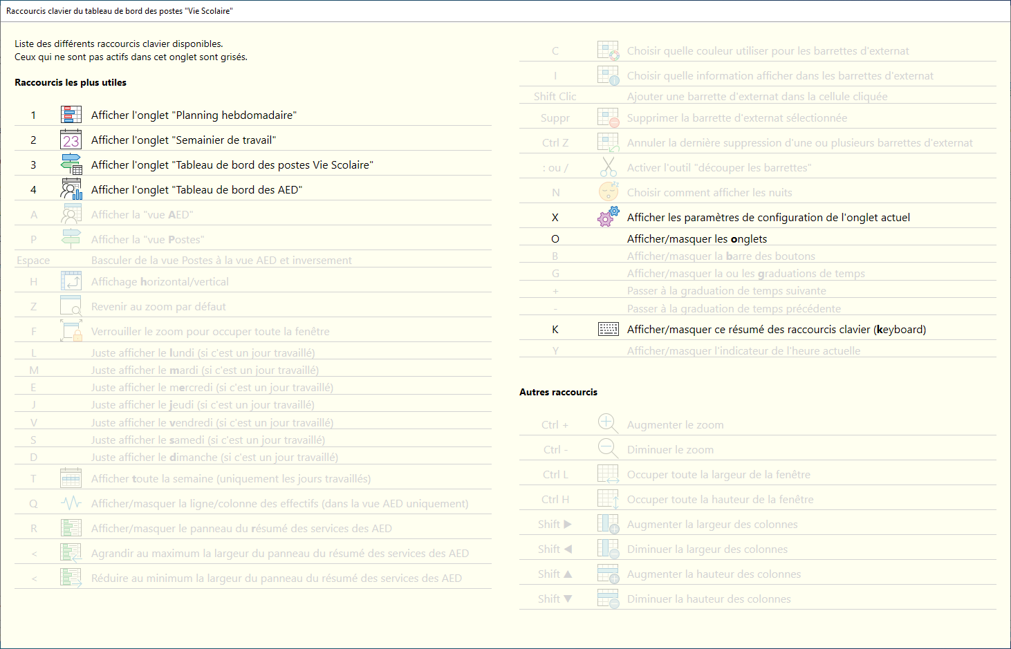 Raccourcis clavier du tableau de bord des postes "Vie Scolaire"