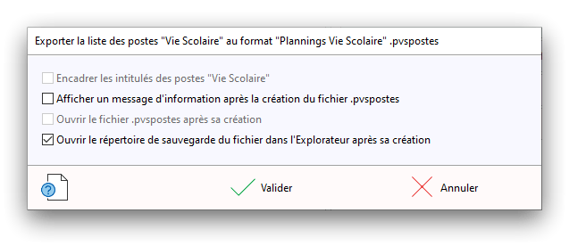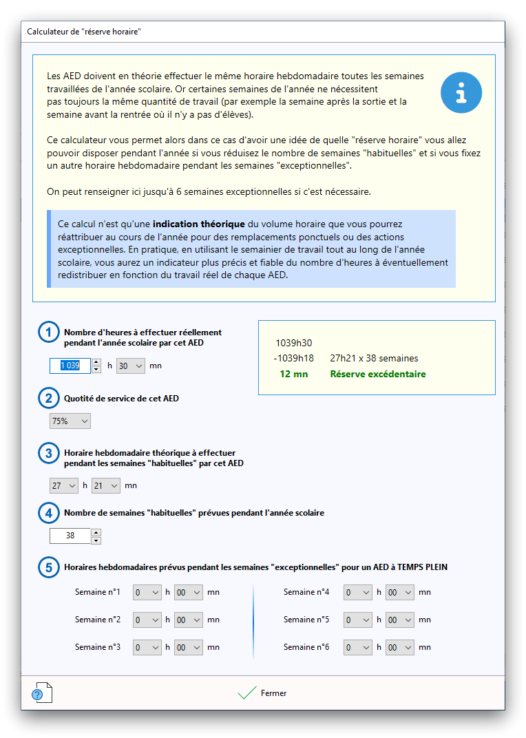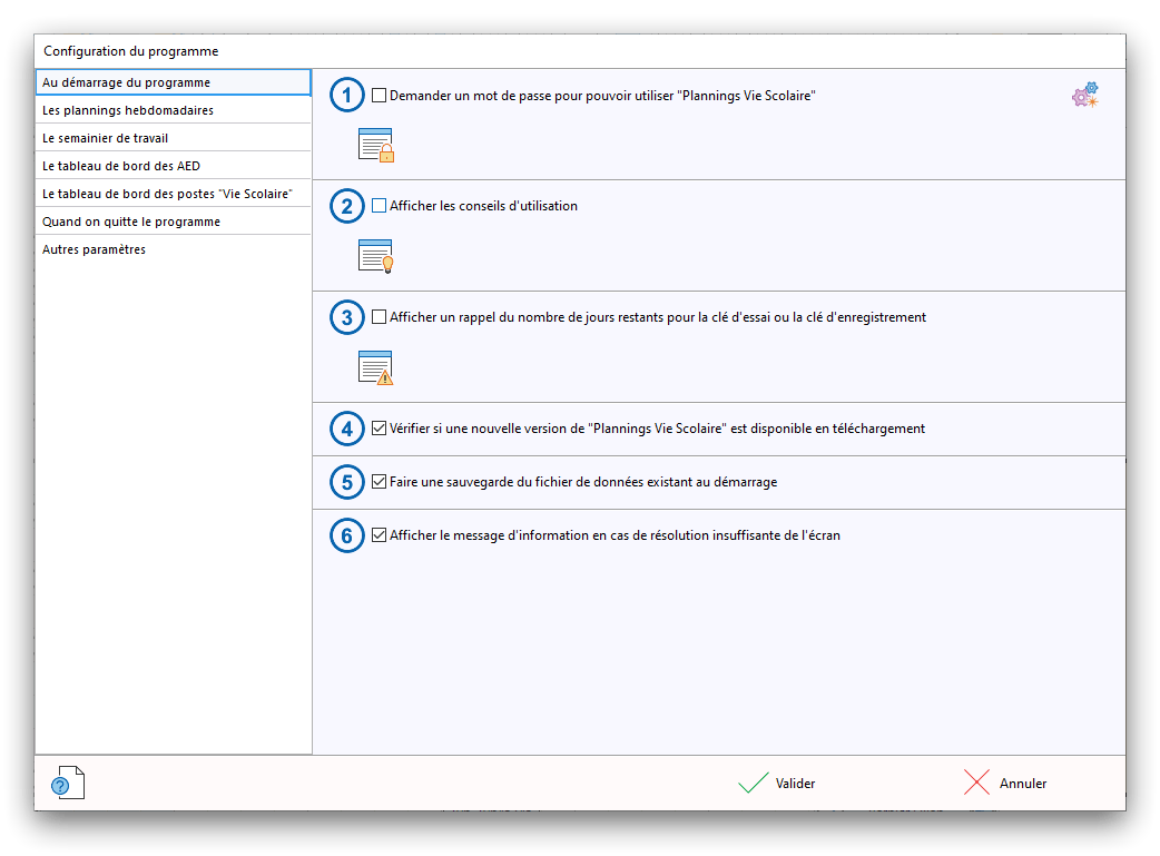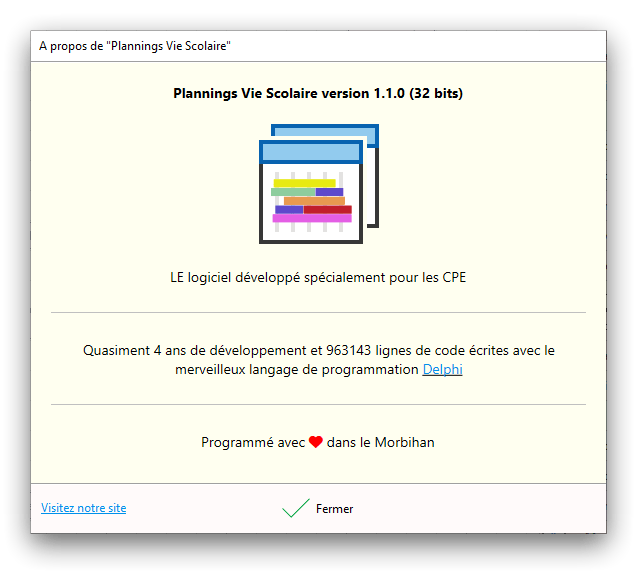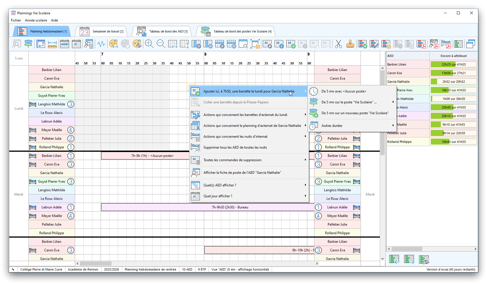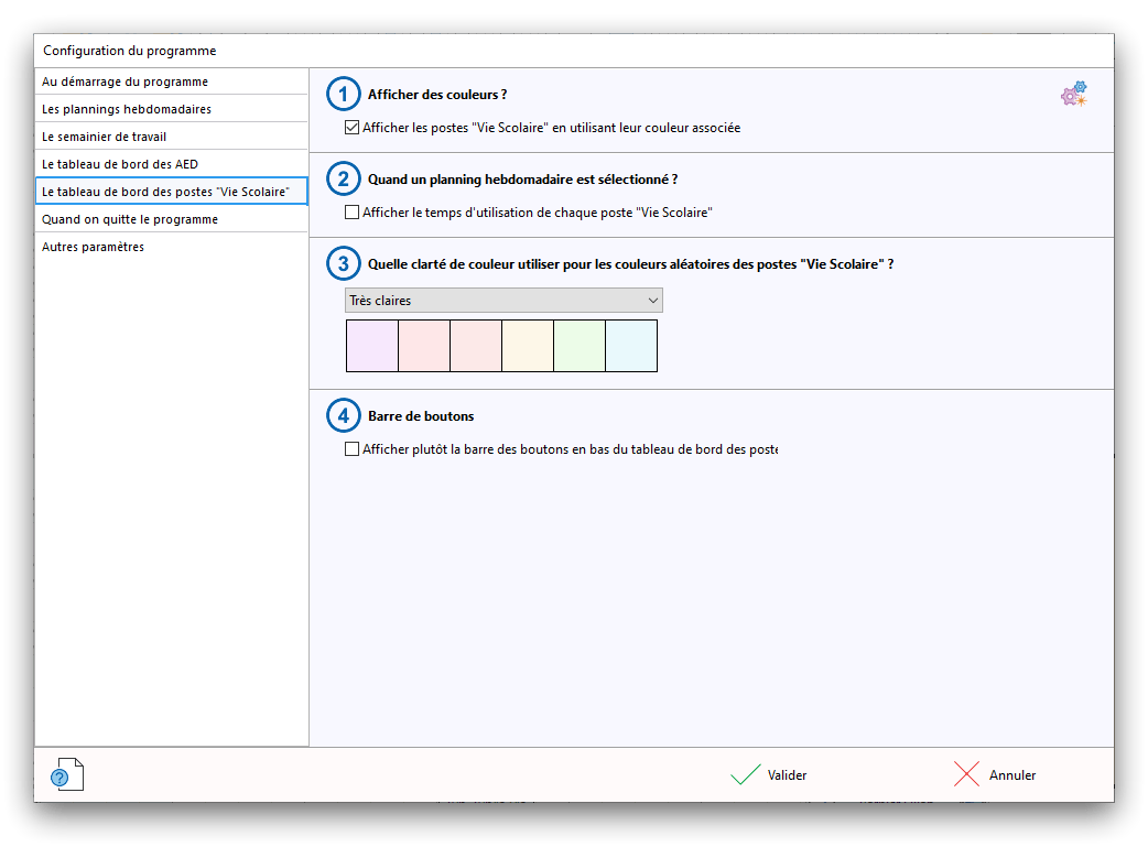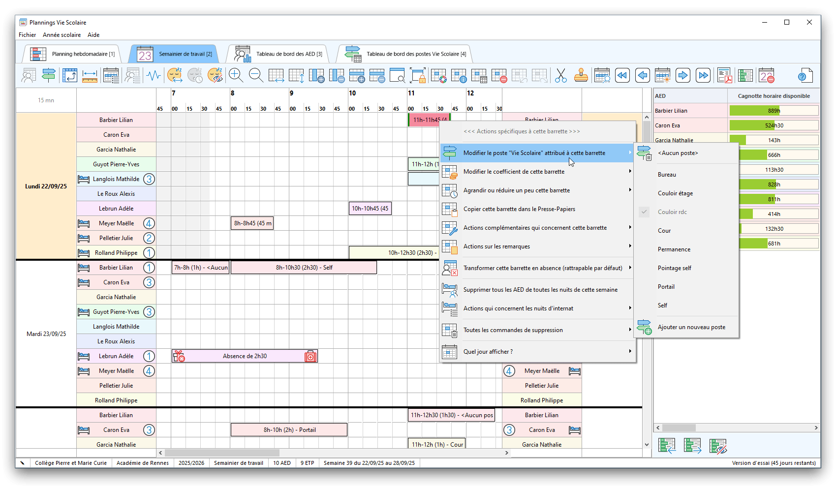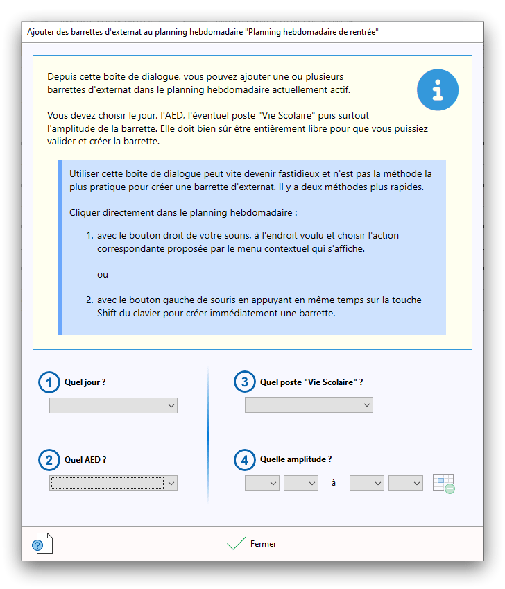 Premier démarrage de « Plannings Vie Scolaire »Créer et activer une clé d’essaiAssistant de démarrageAssistant de démarrage – Etape 1 – Choisir l’année scolaireAssistant de démarrage – Etape 2 – Définir vos plages horaires quotidiennes – Exemple d’organisation hebdomadaireAssistant de démarrage – Etape 3 – Vérifier les paramètres et fixer vos critères de calcul des horairesAssistant de démarrage – Etape 4 – Récupérer le calendrier scolaireAssistant de démarrage – Etape 5 – Créer votre liste de postes « Vie Scolaire »Liste des postes « Vie Scolaire » habituelsAssistant de démarrage – Etape 5 – Créer votre liste de postes « Vie Scolaire » – Liste complétéeAssistant de démarrage – Etape 6 – Créer votre équipe d’AEDAssistant de démarrage – Etape 6 – Créer votre équipe d’AED – Equipe fictiveCréer plusieurs AEDCréer un nouvel AEDAssistant de démarrage terminéOnglet 1 – Planning hebdomadaireUn planning hebdomadaireUn planning hebdomadaire en « Vue AED » – Affichage du panneau du résumé des servicesPlanning hebdomadaire – Menu contextuel sur un AEDPlanning hebdomadaire – Menu contextuel sur un jourPlanning hebdomadaire – Menu contextuel sur une cellule videPlanning hebdomadaire – Menu contextuel sur le panneau du résumé des servicesUn planning hebdomadaire en « Vue AED » – Affichage du nombre d’AED dans la journéeDans un planning hebdomadaire, choisir quel(s) AED afficher – Toute l’équipeDans un planning hebdomadaire, choisir quel(s) AED afficher – Une partie de l’équipeUn planning hebdomadaire en « Vue AED » – Affichage d’une partie de l’équipeUn planning hebdomadaire en « Vue AED » – Affichage d’un seul jourUn planning hebdomadaire en « Vue Poste » – Affichage horizontalUn planning hebdomadaire en « Vue Poste » – Affichage verticalUn planning hebdomadaire en « Vue AED » – Affichage verticalAjouter un nouveau planning hebdomadaireModifier les informations d’un planning hebdomadairePlanning hebdomadaire – Ajouter une ou plusieurs barrettesSimulateur d’horaire hebdomadaire théoriqueCalculateur de « réserve horaire »Voir votre organisation hebdomadaire actuelleOnglet 2 – Le semainier de travail n’est pas encore crééOnglet 2 – Le semainier de travailOnglet 2 – Le semainier de travail avec le panneau du résumé des services détailléLe semainier de travail avec une absenceSemainier de travail – Menu contextuel sur un AEDSemainier de travail – Menu contextuel sur une barrette existanteSemainier de travail – Menu contextuel sur le panneau du résumé des servicesSemainier de travail – Menu contextuel sur une barrette d’absenceSynthèse du temps de travail d’un AED sous forme de graphiqueSynthèse du temps de travail d’un AED sous forme de tableauAjouter un événement exceptionnel – ExempleAjouter une ouverture exceptionnelle – ExempleOnglet 3 – Tableau de bord des AEDTableau de bord des AED – Menu contextuelOnglet 4 – Tableau de bord des postes Vie ScolaireTableau de bord des postes Vie Scolaire – Menu contextuelCréer un poste « Vie Scolaire »Exporter la liste des postes « Vie Scolaire » au format texteExporter la liste des postes « Vie Scolaire » au format PDFExporter la liste des postes Vie Scolaire au format « Plannings Vie Scolaire »Les raccourcis clavier – Plannings hebdomadairesLes raccourcis clavier – Semainier de travailLes raccourcis clavier – Tableau de bord des AEDLes raccourcis clavier – Tableau de bord des postes Vie ScolaireOutils – Copier votre fichier de donnéesOutils – Récupérer un fichier de donnéesOutils – Restaurer un fichier de données sauvegardéCréer la fiche de poste des AED au format PDFExporter un planning hebdomadaire au format PDFExporter le bilan de l’internat au format PDFExporter un rapport d’activité au format PDFConfiguration – Au démarrage du programmeConfiguration – Les plannings hebdomadairesConfiguration – Le semainier de travailConfiguration – Tableau de bord des AEDConfiguration – Tableau de bord des postes « Vie Scolaire »Configuration – Quand on quitte le programmeConfiguration – Autres paramètresConseils et astuces d’utilisationInformations techniquesA propos de « Plannings Vie Scolaire »