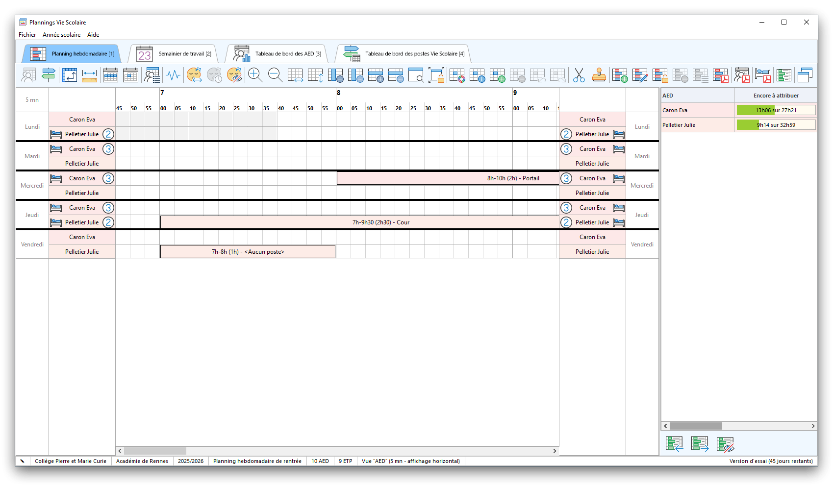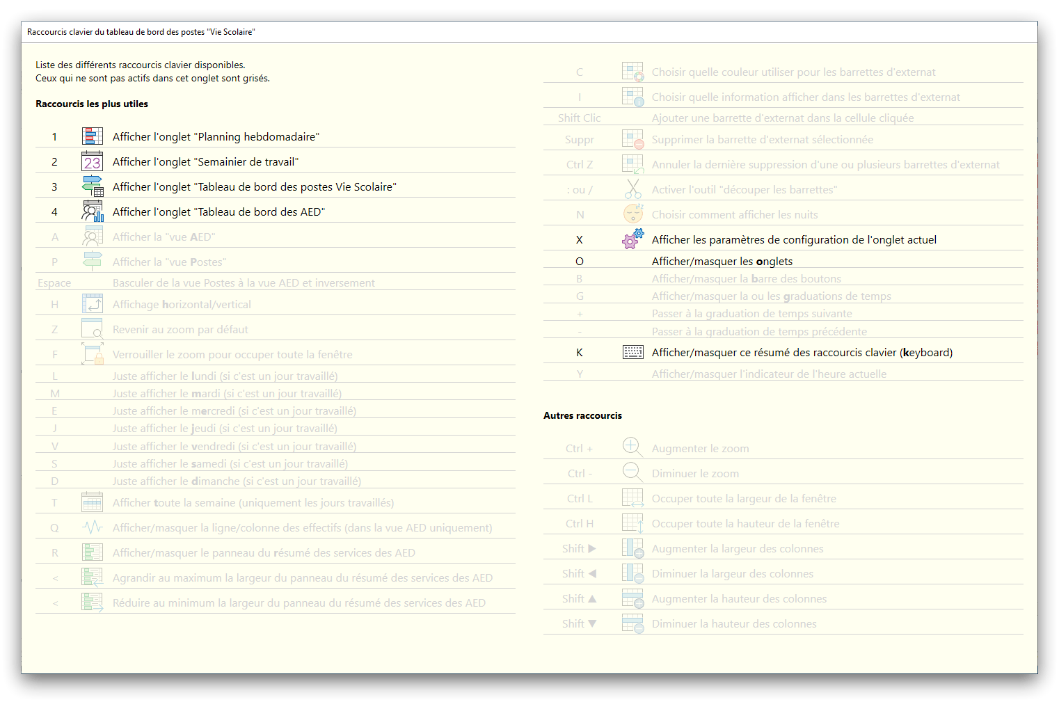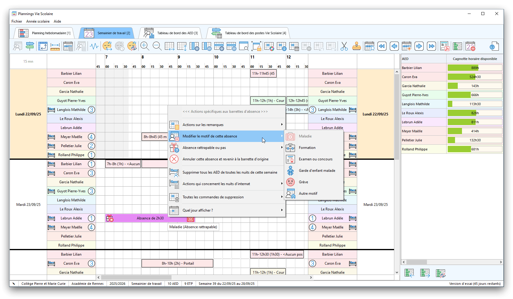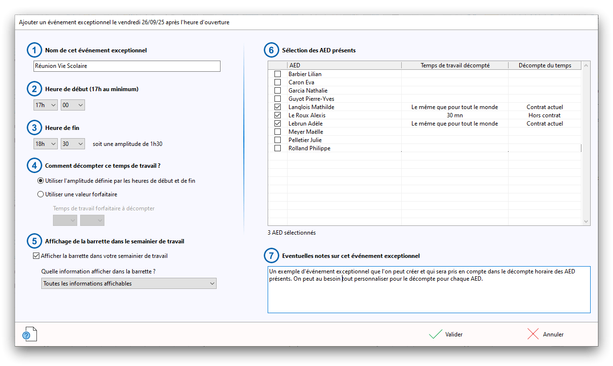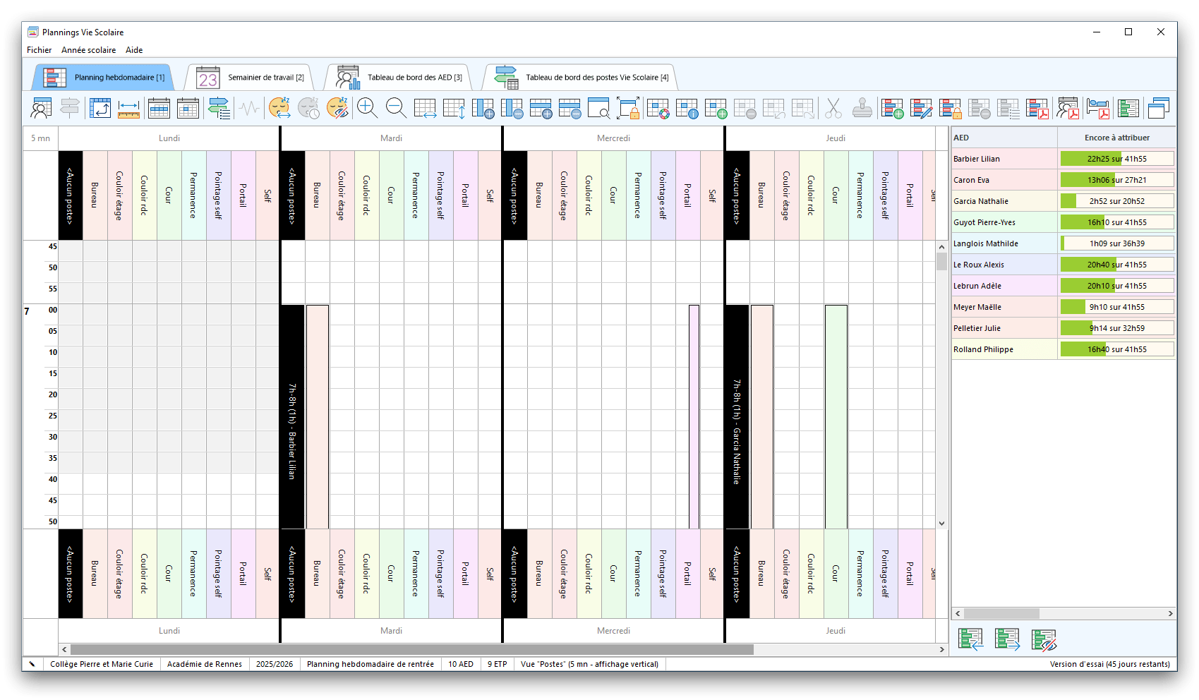 Premier démarrage de « Plannings Vie Scolaire »Créer et activer une clé d’essaiAssistant de démarrageAssistant de démarrage – Etape 1 – Choisir l’année scolaireAssistant de démarrage – Etape 2 – Définir vos plages horaires quotidiennes – Exemple d’organisation hebdomadaireAssistant de démarrage – Etape 3 – Vérifier les paramètres et fixer vos critères de calcul des horairesAssistant de démarrage – Etape 4 – Récupérer le calendrier scolaireAssistant de démarrage – Etape 5 – Créer votre liste de postes « Vie Scolaire »Liste des postes « Vie Scolaire » habituelsAssistant de démarrage – Etape 5 – Créer votre liste de postes « Vie Scolaire » – Liste complétéeAssistant de démarrage – Etape 6 – Créer votre équipe d’AEDAssistant de démarrage – Etape 6 – Créer votre équipe d’AED – Equipe fictiveCréer plusieurs AEDCréer un nouvel AEDAssistant de démarrage terminéOnglet 1 – Planning hebdomadaireUn planning hebdomadaireUn planning hebdomadaire en « Vue AED » – Affichage du panneau du résumé des servicesPlanning hebdomadaire – Menu contextuel sur un AEDPlanning hebdomadaire – Menu contextuel sur un jourPlanning hebdomadaire – Menu contextuel sur une cellule videPlanning hebdomadaire – Menu contextuel sur le panneau du résumé des servicesUn planning hebdomadaire en « Vue AED » – Affichage du nombre d’AED dans la journéeDans un planning hebdomadaire, choisir quel(s) AED afficher – Toute l’équipeDans un planning hebdomadaire, choisir quel(s) AED afficher – Une partie de l’équipeUn planning hebdomadaire en « Vue AED » – Affichage d’une partie de l’équipeUn planning hebdomadaire en « Vue AED » – Affichage d’un seul jourUn planning hebdomadaire en « Vue Poste » – Affichage horizontalUn planning hebdomadaire en « Vue Poste » – Affichage verticalUn planning hebdomadaire en « Vue AED » – Affichage verticalAjouter un nouveau planning hebdomadaireModifier les informations d’un planning hebdomadairePlanning hebdomadaire – Ajouter une ou plusieurs barrettesSimulateur d’horaire hebdomadaire théoriqueCalculateur de « réserve horaire »Voir votre organisation hebdomadaire actuelleOnglet 2 – Le semainier de travail n’est pas encore crééOnglet 2 – Le semainier de travailOnglet 2 – Le semainier de travail avec le panneau du résumé des services détailléLe semainier de travail avec une absenceSemainier de travail – Menu contextuel sur un AEDSemainier de travail – Menu contextuel sur une barrette existanteSemainier de travail – Menu contextuel sur le panneau du résumé des servicesSemainier de travail – Menu contextuel sur une barrette d’absenceSynthèse du temps de travail d’un AED sous forme de graphiqueSynthèse du temps de travail d’un AED sous forme de tableauAjouter un événement exceptionnel – ExempleAjouter une ouverture exceptionnelle – ExempleOnglet 3 – Tableau de bord des AEDTableau de bord des AED – Menu contextuelOnglet 4 – Tableau de bord des postes Vie ScolaireTableau de bord des postes Vie Scolaire – Menu contextuelCréer un poste « Vie Scolaire »Exporter la liste des postes « Vie Scolaire » au format texteExporter la liste des postes « Vie Scolaire » au format PDFExporter la liste des postes Vie Scolaire au format « Plannings Vie Scolaire »Les raccourcis clavier – Plannings hebdomadairesLes raccourcis clavier – Semainier de travailLes raccourcis clavier – Tableau de bord des AEDLes raccourcis clavier – Tableau de bord des postes Vie ScolaireOutils – Copier votre fichier de donnéesOutils – Récupérer un fichier de donnéesOutils – Restaurer un fichier de données sauvegardéCréer la fiche de poste des AED au format PDFExporter un planning hebdomadaire au format PDFExporter le bilan de l’internat au format PDFExporter un rapport d’activité au format PDFConfiguration – Au démarrage du programmeConfiguration – Les plannings hebdomadairesConfiguration – Le semainier de travailConfiguration – Tableau de bord des AEDConfiguration – Tableau de bord des postes « Vie Scolaire »Configuration – Quand on quitte le programmeConfiguration – Autres paramètresConseils et astuces d’utilisationInformations techniquesA propos de « Plannings Vie Scolaire »