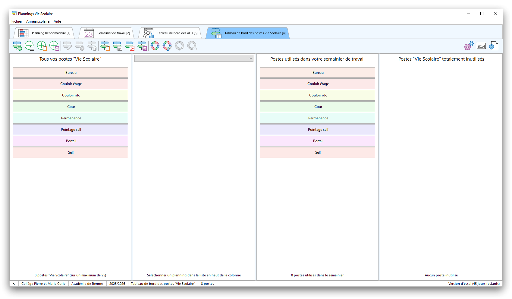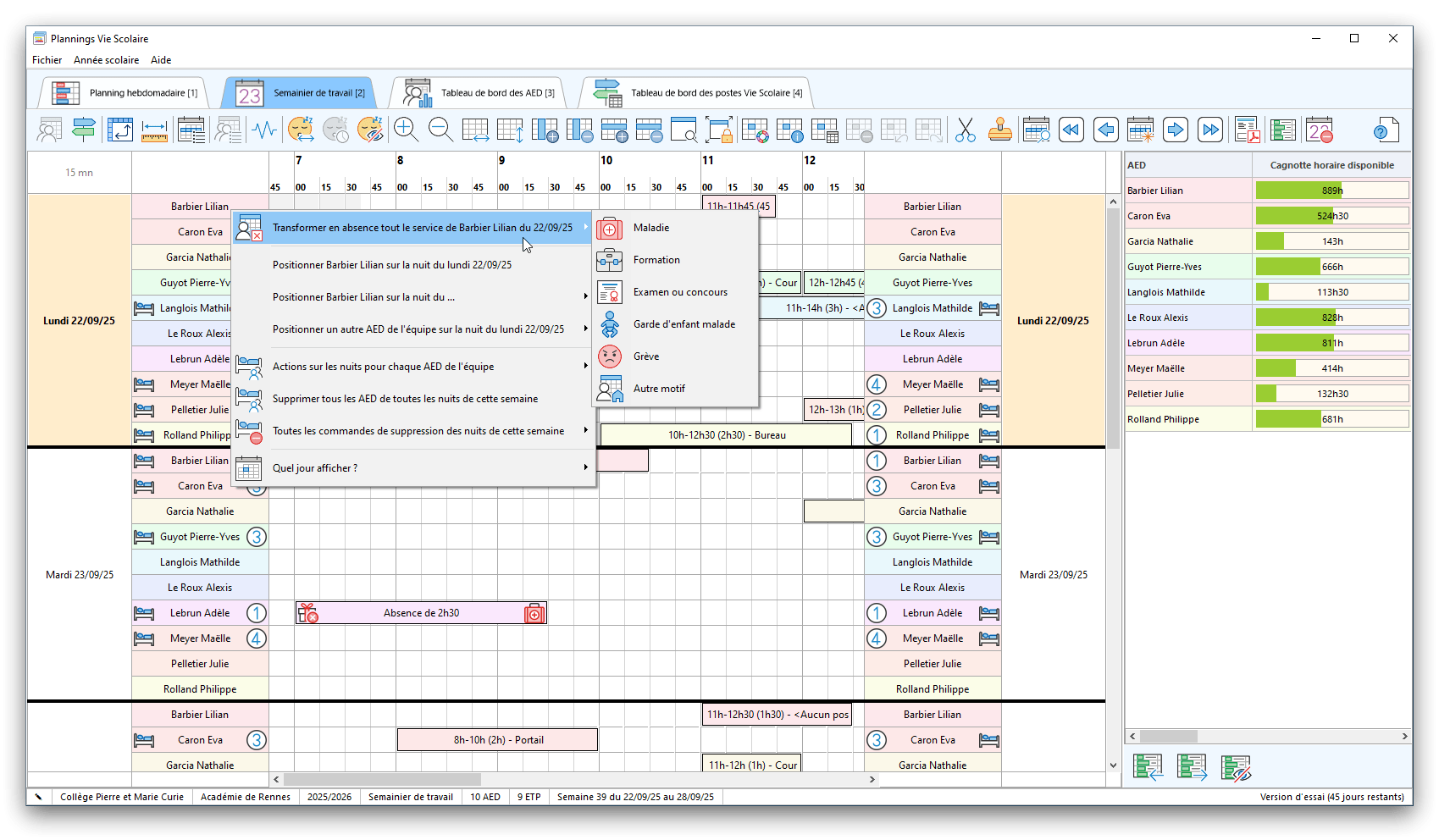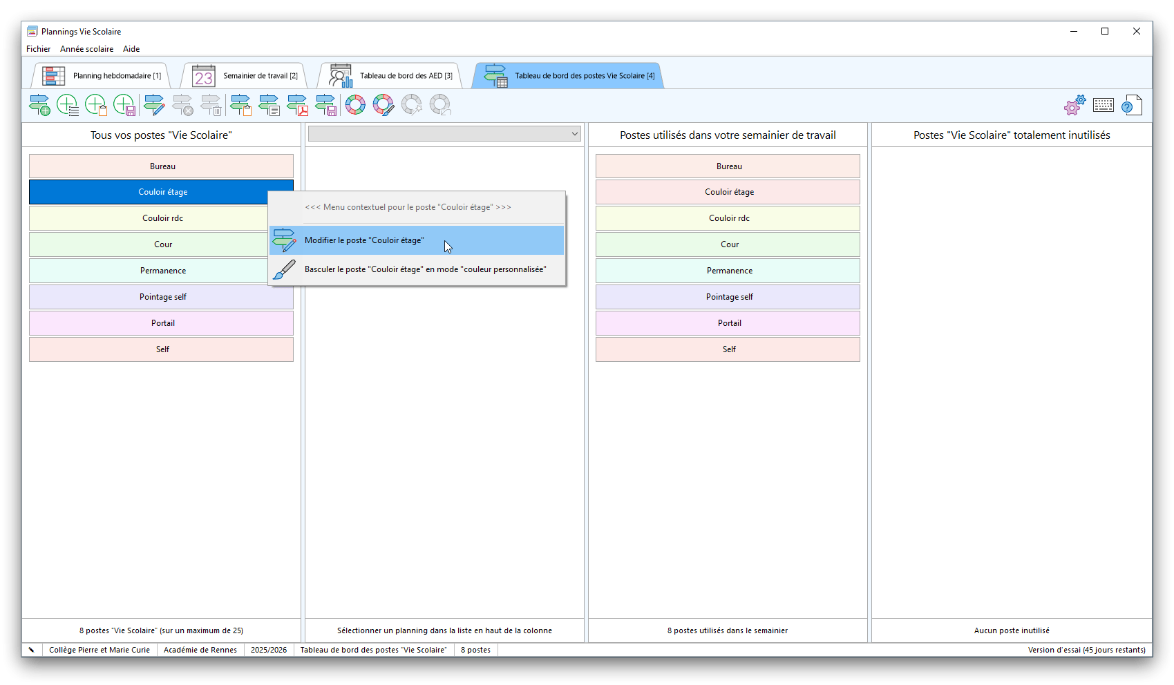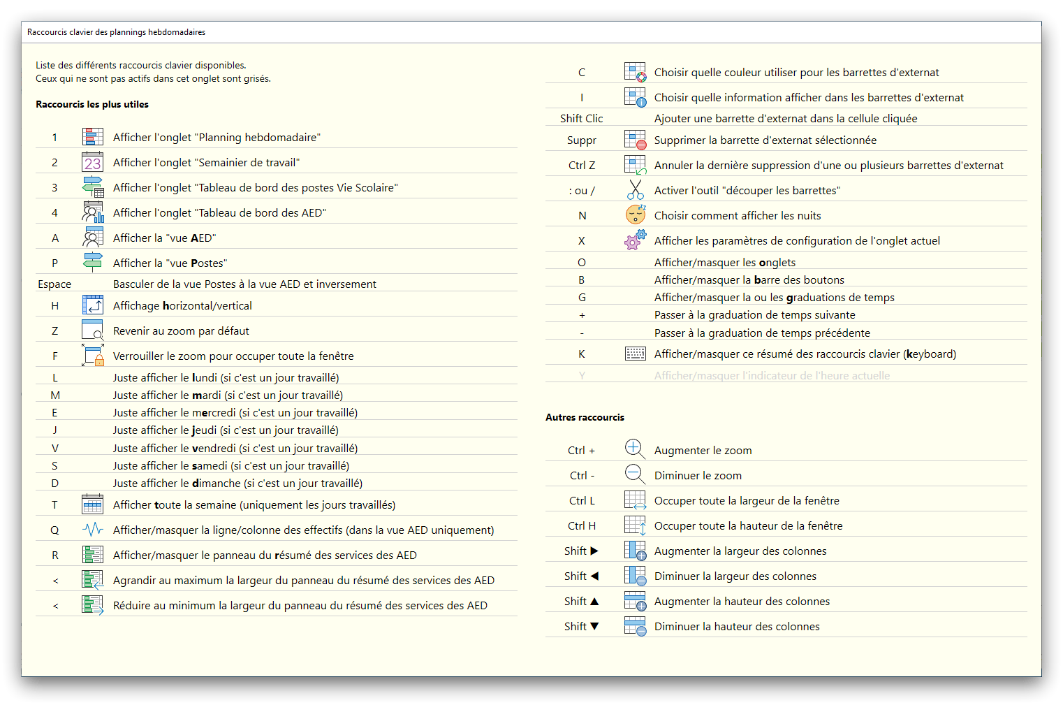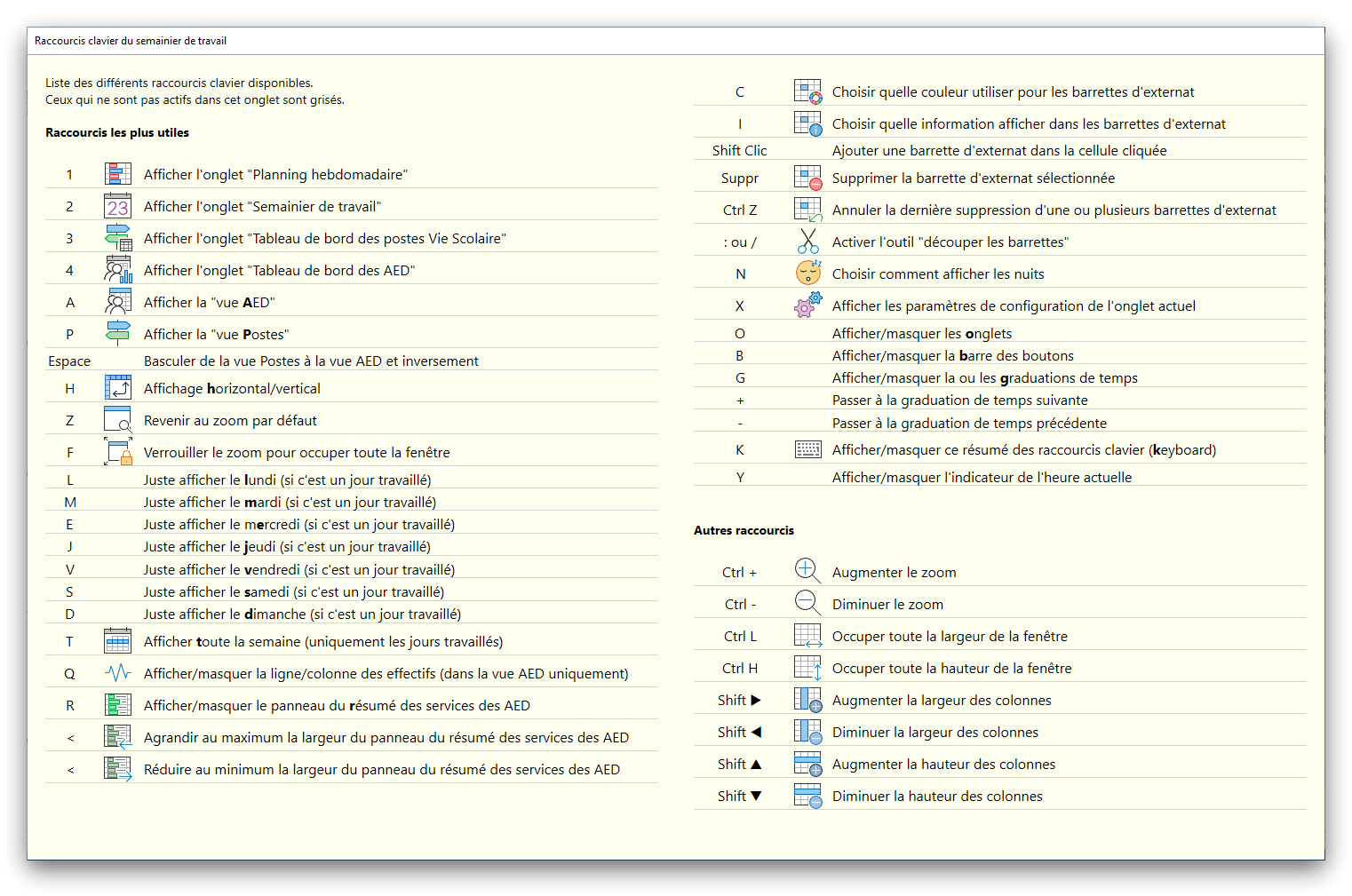 Premier démarrage de « Plannings Vie Scolaire »Créer et activer une clé d’essaiAssistant de démarrageAssistant de démarrage – Etape 1 – Choisir l’année scolaireAssistant de démarrage – Etape 2 – Définir vos plages horaires quotidiennes – Exemple d’organisation hebdomadaireAssistant de démarrage – Etape 3 – Vérifier les paramètres et fixer vos critères de calcul des horairesAssistant de démarrage – Etape 4 – Récupérer le calendrier scolaireAssistant de démarrage – Etape 5 – Créer votre liste de postes « Vie Scolaire »Liste des postes « Vie Scolaire » habituelsAssistant de démarrage – Etape 5 – Créer votre liste de postes « Vie Scolaire » – Liste complétéeAssistant de démarrage – Etape 6 – Créer votre équipe d’AEDAssistant de démarrage – Etape 6 – Créer votre équipe d’AED – Equipe fictiveCréer plusieurs AEDCréer un nouvel AEDAssistant de démarrage terminéOnglet 1 – Planning hebdomadaireUn planning hebdomadaireUn planning hebdomadaire en « Vue AED » – Affichage du panneau du résumé des servicesPlanning hebdomadaire – Menu contextuel sur un AEDPlanning hebdomadaire – Menu contextuel sur un jourPlanning hebdomadaire – Menu contextuel sur une cellule videPlanning hebdomadaire – Menu contextuel sur le panneau du résumé des servicesUn planning hebdomadaire en « Vue AED » – Affichage du nombre d’AED dans la journéeDans un planning hebdomadaire, choisir quel(s) AED afficher – Toute l’équipeDans un planning hebdomadaire, choisir quel(s) AED afficher – Une partie de l’équipeUn planning hebdomadaire en « Vue AED » – Affichage d’une partie de l’équipeUn planning hebdomadaire en « Vue AED » – Affichage d’un seul jourUn planning hebdomadaire en « Vue Poste » – Affichage horizontalUn planning hebdomadaire en « Vue Poste » – Affichage verticalUn planning hebdomadaire en « Vue AED » – Affichage verticalAjouter un nouveau planning hebdomadaireModifier les informations d’un planning hebdomadairePlanning hebdomadaire – Ajouter une ou plusieurs barrettesSimulateur d’horaire hebdomadaire théoriqueCalculateur de « réserve horaire »Voir votre organisation hebdomadaire actuelleOnglet 2 – Le semainier de travail n’est pas encore crééOnglet 2 – Le semainier de travailOnglet 2 – Le semainier de travail avec le panneau du résumé des services détailléLe semainier de travail avec une absenceSemainier de travail – Menu contextuel sur un AEDSemainier de travail – Menu contextuel sur une barrette existanteSemainier de travail – Menu contextuel sur le panneau du résumé des servicesSemainier de travail – Menu contextuel sur une barrette d’absenceSynthèse du temps de travail d’un AED sous forme de graphiqueSynthèse du temps de travail d’un AED sous forme de tableauAjouter un événement exceptionnel – ExempleAjouter une ouverture exceptionnelle – ExempleOnglet 3 – Tableau de bord des AEDTableau de bord des AED – Menu contextuelOnglet 4 – Tableau de bord des postes Vie ScolaireTableau de bord des postes Vie Scolaire – Menu contextuelCréer un poste « Vie Scolaire »Exporter la liste des postes « Vie Scolaire » au format texteExporter la liste des postes « Vie Scolaire » au format PDFExporter la liste des postes Vie Scolaire au format « Plannings Vie Scolaire »Les raccourcis clavier – Plannings hebdomadairesLes raccourcis clavier – Semainier de travailLes raccourcis clavier – Tableau de bord des AEDLes raccourcis clavier – Tableau de bord des postes Vie ScolaireOutils – Copier votre fichier de donnéesOutils – Récupérer un fichier de donnéesOutils – Restaurer un fichier de données sauvegardéCréer la fiche de poste des AED au format PDFExporter un planning hebdomadaire au format PDFExporter le bilan de l’internat au format PDFExporter un rapport d’activité au format PDFConfiguration – Au démarrage du programmeConfiguration – Les plannings hebdomadairesConfiguration – Le semainier de travailConfiguration – Tableau de bord des AEDConfiguration – Tableau de bord des postes « Vie Scolaire »Configuration – Quand on quitte le programmeConfiguration – Autres paramètresConseils et astuces d’utilisationInformations techniquesA propos de « Plannings Vie Scolaire »