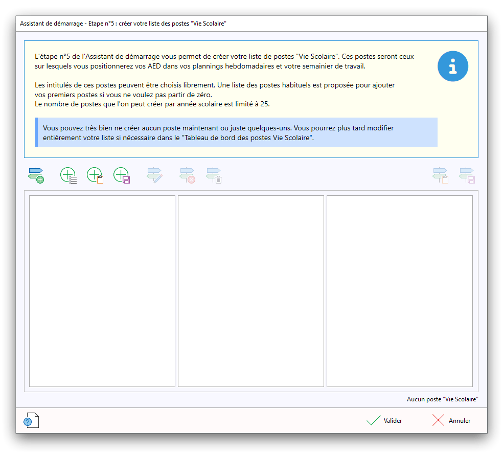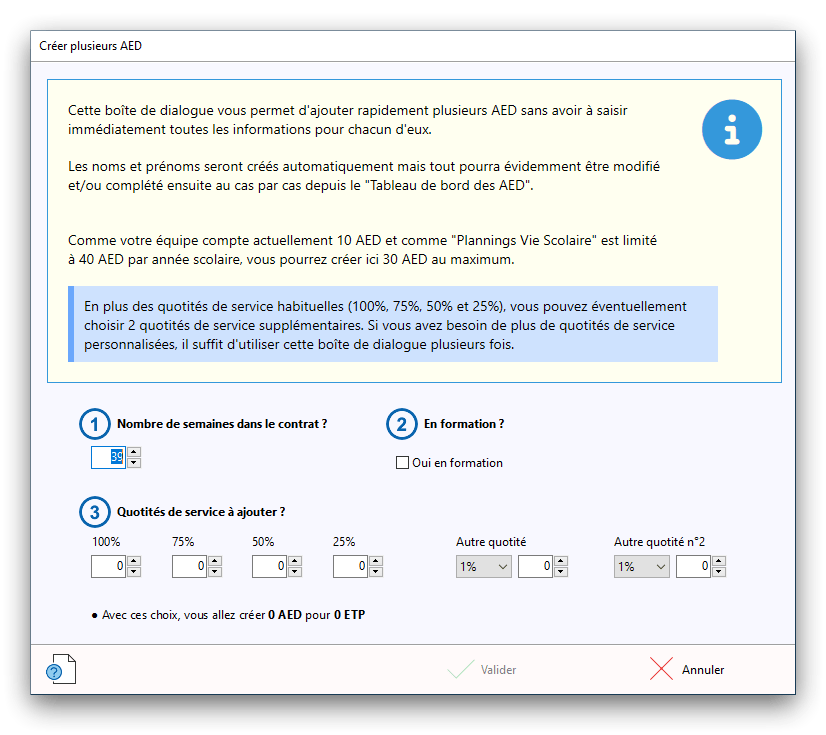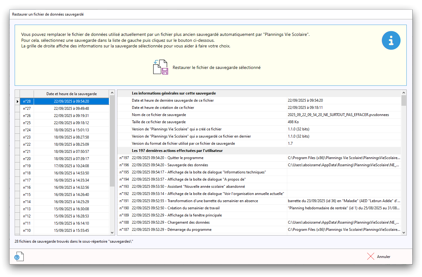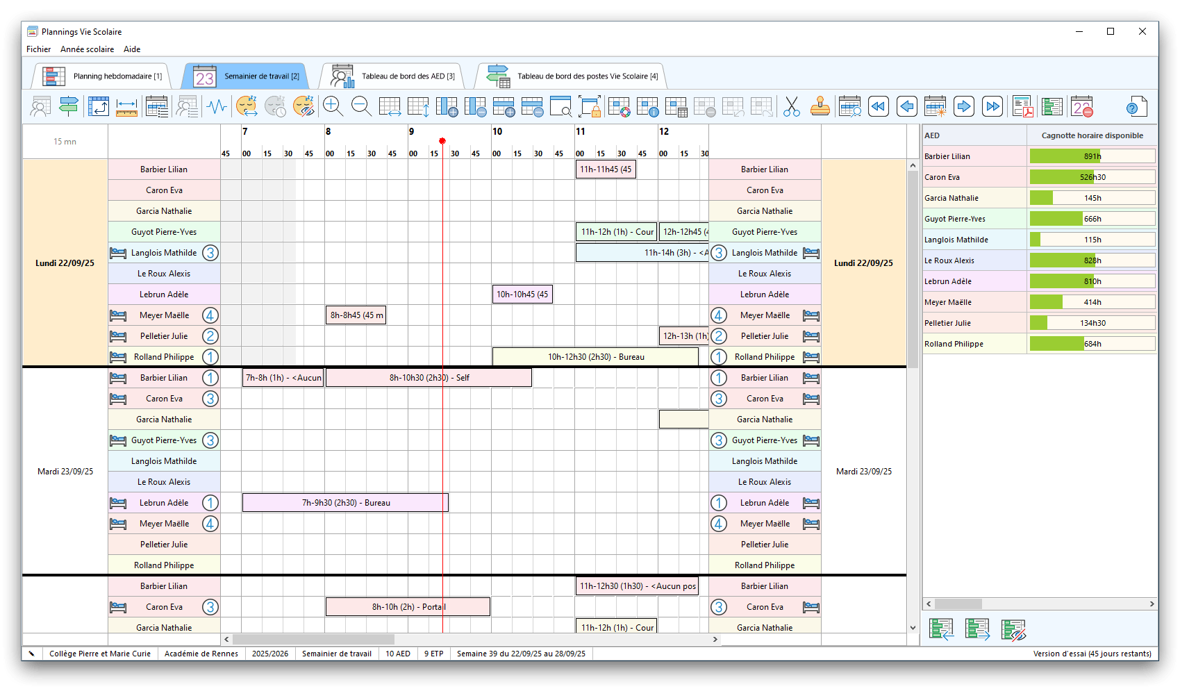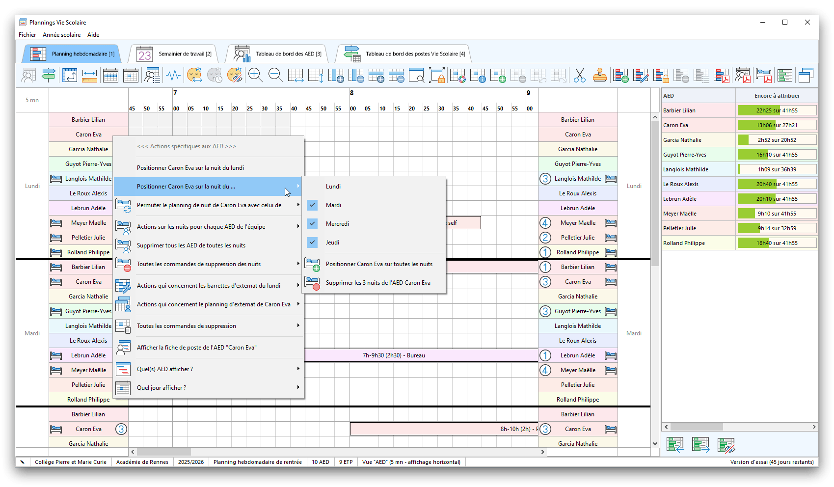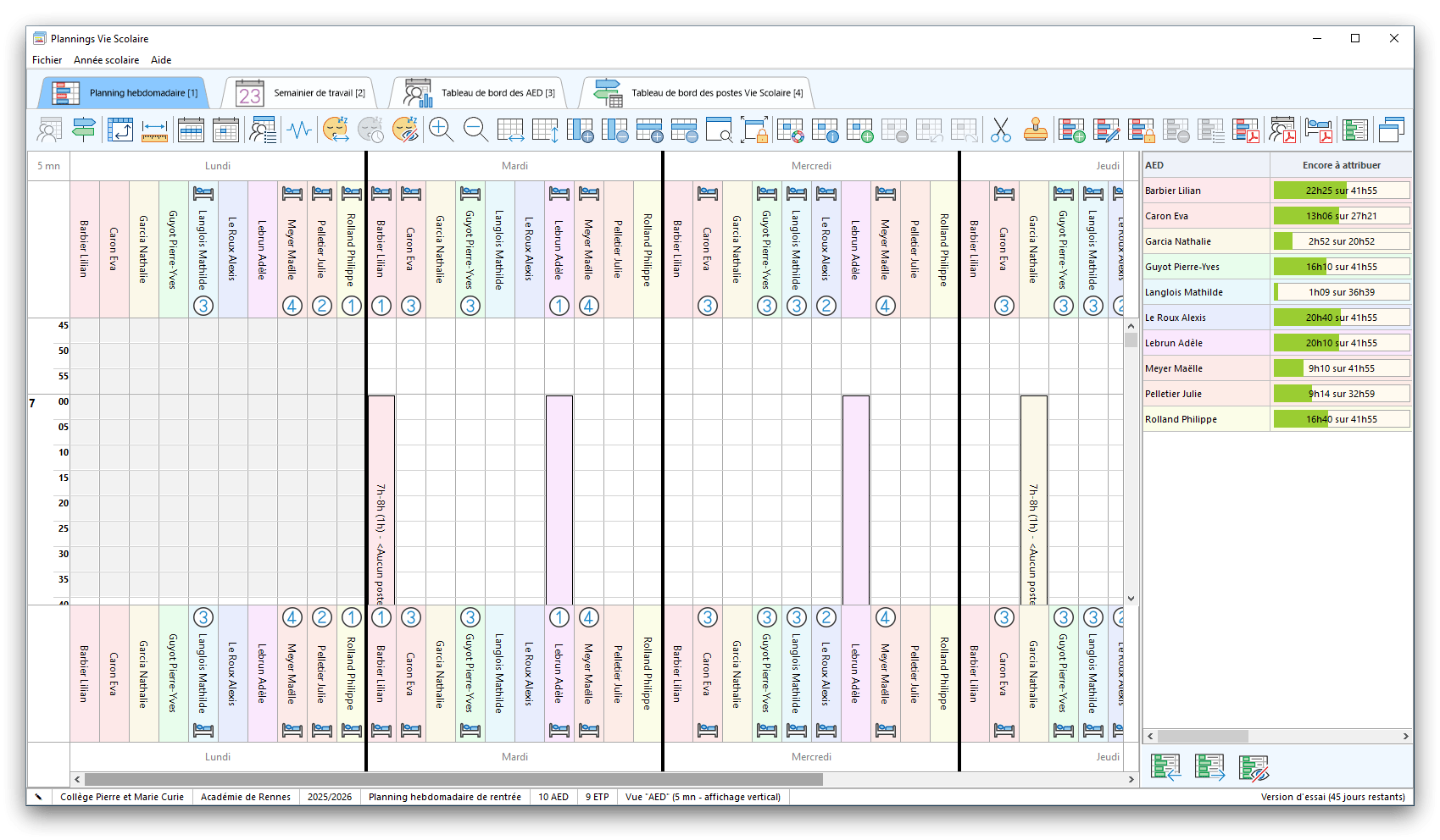 Premier démarrage de « Plannings Vie Scolaire »Créer et activer une clé d’essaiAssistant de démarrageAssistant de démarrage – Etape 1 – Choisir l’année scolaireAssistant de démarrage – Etape 2 – Définir vos plages horaires quotidiennes – Exemple d’organisation hebdomadaireAssistant de démarrage – Etape 3 – Vérifier les paramètres et fixer vos critères de calcul des horairesAssistant de démarrage – Etape 4 – Récupérer le calendrier scolaireAssistant de démarrage – Etape 5 – Créer votre liste de postes « Vie Scolaire »Liste des postes « Vie Scolaire » habituelsAssistant de démarrage – Etape 5 – Créer votre liste de postes « Vie Scolaire » – Liste complétéeAssistant de démarrage – Etape 6 – Créer votre équipe d’AEDAssistant de démarrage – Etape 6 – Créer votre équipe d’AED – Equipe fictiveCréer plusieurs AEDCréer un nouvel AEDAssistant de démarrage terminéOnglet 1 – Planning hebdomadaireUn planning hebdomadaireUn planning hebdomadaire en « Vue AED » – Affichage du panneau du résumé des servicesPlanning hebdomadaire – Menu contextuel sur un AEDPlanning hebdomadaire – Menu contextuel sur un jourPlanning hebdomadaire – Menu contextuel sur une cellule videPlanning hebdomadaire – Menu contextuel sur le panneau du résumé des servicesUn planning hebdomadaire en « Vue AED » – Affichage du nombre d’AED dans la journéeDans un planning hebdomadaire, choisir quel(s) AED afficher – Toute l’équipeDans un planning hebdomadaire, choisir quel(s) AED afficher – Une partie de l’équipeUn planning hebdomadaire en « Vue AED » – Affichage d’une partie de l’équipeUn planning hebdomadaire en « Vue AED » – Affichage d’un seul jourUn planning hebdomadaire en « Vue Poste » – Affichage horizontalUn planning hebdomadaire en « Vue Poste » – Affichage verticalUn planning hebdomadaire en « Vue AED » – Affichage verticalAjouter un nouveau planning hebdomadaireModifier les informations d’un planning hebdomadairePlanning hebdomadaire – Ajouter une ou plusieurs barrettesSimulateur d’horaire hebdomadaire théoriqueCalculateur de « réserve horaire »Voir votre organisation hebdomadaire actuelleOnglet 2 – Le semainier de travail n’est pas encore crééOnglet 2 – Le semainier de travailOnglet 2 – Le semainier de travail avec le panneau du résumé des services détailléLe semainier de travail avec une absenceSemainier de travail – Menu contextuel sur un AEDSemainier de travail – Menu contextuel sur une barrette existanteSemainier de travail – Menu contextuel sur le panneau du résumé des servicesSemainier de travail – Menu contextuel sur une barrette d’absenceSynthèse du temps de travail d’un AED sous forme de graphiqueSynthèse du temps de travail d’un AED sous forme de tableauAjouter un événement exceptionnel – ExempleAjouter une ouverture exceptionnelle – ExempleOnglet 3 – Tableau de bord des AEDTableau de bord des AED – Menu contextuelOnglet 4 – Tableau de bord des postes Vie ScolaireTableau de bord des postes Vie Scolaire – Menu contextuelCréer un poste « Vie Scolaire »Exporter la liste des postes « Vie Scolaire » au format texteExporter la liste des postes « Vie Scolaire » au format PDFExporter la liste des postes Vie Scolaire au format « Plannings Vie Scolaire »Les raccourcis clavier – Plannings hebdomadairesLes raccourcis clavier – Semainier de travailLes raccourcis clavier – Tableau de bord des AEDLes raccourcis clavier – Tableau de bord des postes Vie ScolaireOutils – Copier votre fichier de donnéesOutils – Récupérer un fichier de donnéesOutils – Restaurer un fichier de données sauvegardéCréer la fiche de poste des AED au format PDFExporter un planning hebdomadaire au format PDFExporter le bilan de l’internat au format PDFExporter un rapport d’activité au format PDFConfiguration – Au démarrage du programmeConfiguration – Les plannings hebdomadairesConfiguration – Le semainier de travailConfiguration – Tableau de bord des AEDConfiguration – Tableau de bord des postes « Vie Scolaire »Configuration – Quand on quitte le programmeConfiguration – Autres paramètresConseils et astuces d’utilisationInformations techniquesA propos de « Plannings Vie Scolaire »