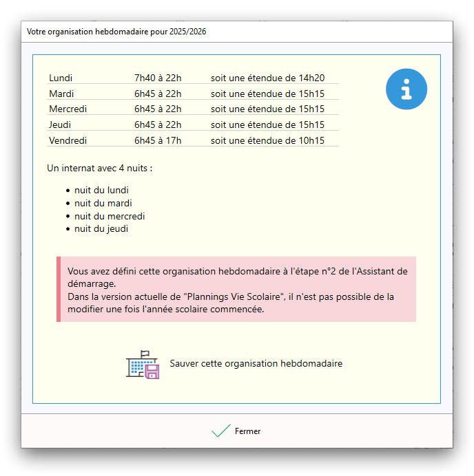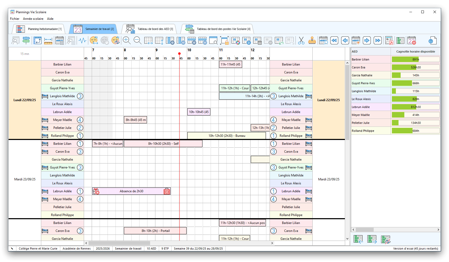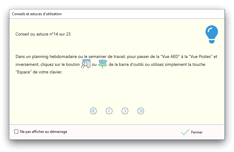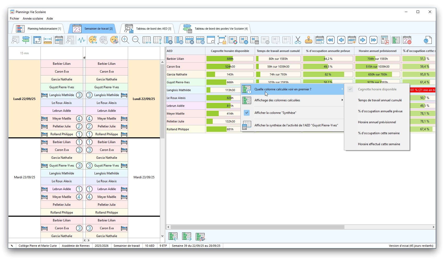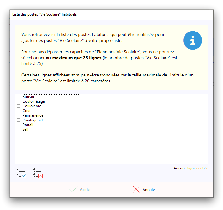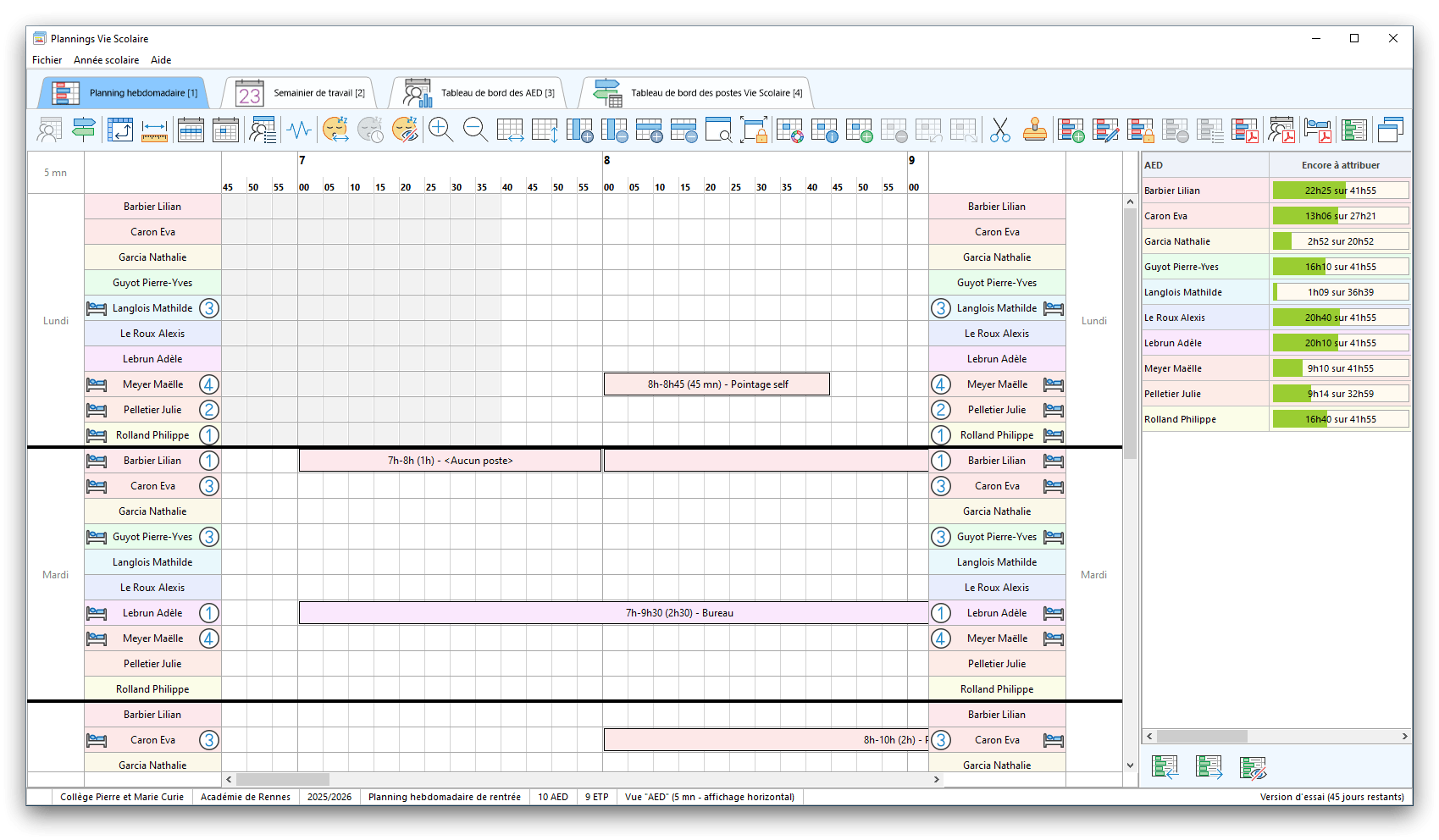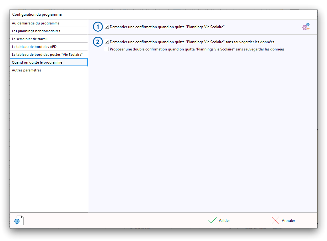 Premier démarrage de « Plannings Vie Scolaire »Créer et activer une clé d’essaiAssistant de démarrageAssistant de démarrage – Etape 1 – Choisir l’année scolaireAssistant de démarrage – Etape 2 – Définir vos plages horaires quotidiennes – Exemple d’organisation hebdomadaireAssistant de démarrage – Etape 3 – Vérifier les paramètres et fixer vos critères de calcul des horairesAssistant de démarrage – Etape 4 – Récupérer le calendrier scolaireAssistant de démarrage – Etape 5 – Créer votre liste de postes « Vie Scolaire »Liste des postes « Vie Scolaire » habituelsAssistant de démarrage – Etape 5 – Créer votre liste de postes « Vie Scolaire » – Liste complétéeAssistant de démarrage – Etape 6 – Créer votre équipe d’AEDAssistant de démarrage – Etape 6 – Créer votre équipe d’AED – Equipe fictiveCréer plusieurs AEDCréer un nouvel AEDAssistant de démarrage terminéOnglet 1 – Planning hebdomadaireUn planning hebdomadaireUn planning hebdomadaire en « Vue AED » – Affichage du panneau du résumé des servicesPlanning hebdomadaire – Menu contextuel sur un AEDPlanning hebdomadaire – Menu contextuel sur un jourPlanning hebdomadaire – Menu contextuel sur une cellule videPlanning hebdomadaire – Menu contextuel sur le panneau du résumé des servicesUn planning hebdomadaire en « Vue AED » – Affichage du nombre d’AED dans la journéeDans un planning hebdomadaire, choisir quel(s) AED afficher – Toute l’équipeDans un planning hebdomadaire, choisir quel(s) AED afficher – Une partie de l’équipeUn planning hebdomadaire en « Vue AED » – Affichage d’une partie de l’équipeUn planning hebdomadaire en « Vue AED » – Affichage d’un seul jourUn planning hebdomadaire en « Vue Poste » – Affichage horizontalUn planning hebdomadaire en « Vue Poste » – Affichage verticalUn planning hebdomadaire en « Vue AED » – Affichage verticalAjouter un nouveau planning hebdomadaireModifier les informations d’un planning hebdomadairePlanning hebdomadaire – Ajouter une ou plusieurs barrettesSimulateur d’horaire hebdomadaire théoriqueCalculateur de « réserve horaire »Voir votre organisation hebdomadaire actuelleOnglet 2 – Le semainier de travail n’est pas encore crééOnglet 2 – Le semainier de travailOnglet 2 – Le semainier de travail avec le panneau du résumé des services détailléLe semainier de travail avec une absenceSemainier de travail – Menu contextuel sur un AEDSemainier de travail – Menu contextuel sur une barrette existanteSemainier de travail – Menu contextuel sur le panneau du résumé des servicesSemainier de travail – Menu contextuel sur une barrette d’absenceSynthèse du temps de travail d’un AED sous forme de graphiqueSynthèse du temps de travail d’un AED sous forme de tableauAjouter un événement exceptionnel – ExempleAjouter une ouverture exceptionnelle – ExempleOnglet 3 – Tableau de bord des AEDTableau de bord des AED – Menu contextuelOnglet 4 – Tableau de bord des postes Vie ScolaireTableau de bord des postes Vie Scolaire – Menu contextuelCréer un poste « Vie Scolaire »Exporter la liste des postes « Vie Scolaire » au format texteExporter la liste des postes « Vie Scolaire » au format PDFExporter la liste des postes Vie Scolaire au format « Plannings Vie Scolaire »Les raccourcis clavier – Plannings hebdomadairesLes raccourcis clavier – Semainier de travailLes raccourcis clavier – Tableau de bord des AEDLes raccourcis clavier – Tableau de bord des postes Vie ScolaireOutils – Copier votre fichier de donnéesOutils – Récupérer un fichier de donnéesOutils – Restaurer un fichier de données sauvegardéCréer la fiche de poste des AED au format PDFExporter un planning hebdomadaire au format PDFExporter le bilan de l’internat au format PDFExporter un rapport d’activité au format PDFConfiguration – Au démarrage du programmeConfiguration – Les plannings hebdomadairesConfiguration – Le semainier de travailConfiguration – Tableau de bord des AEDConfiguration – Tableau de bord des postes « Vie Scolaire »Configuration – Quand on quitte le programmeConfiguration – Autres paramètresConseils et astuces d’utilisationInformations techniquesA propos de « Plannings Vie Scolaire »