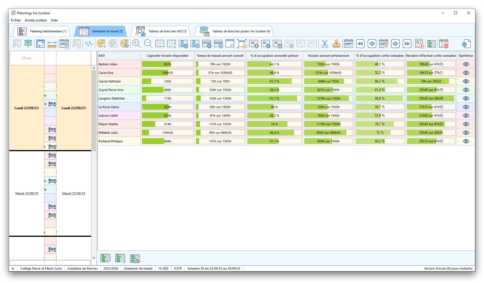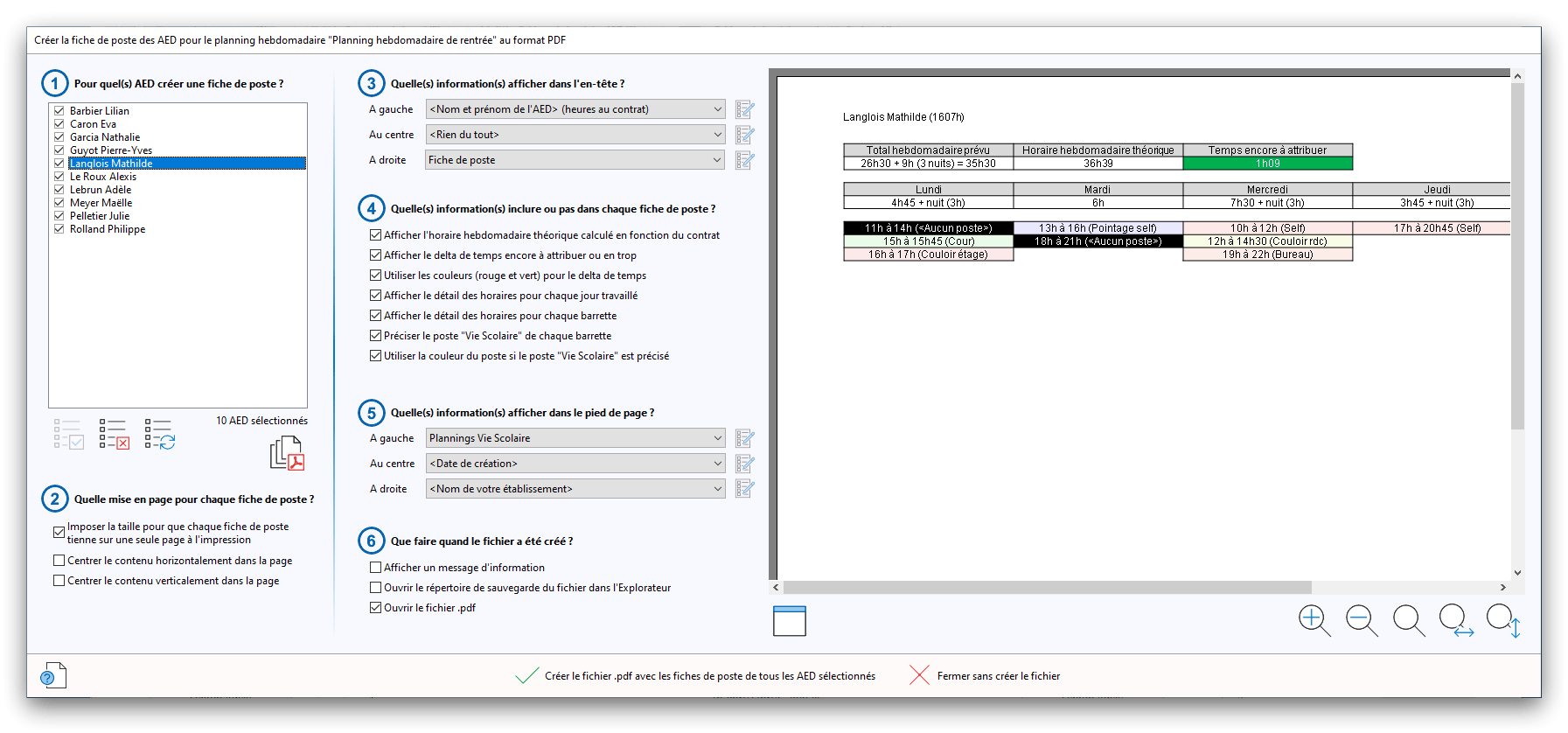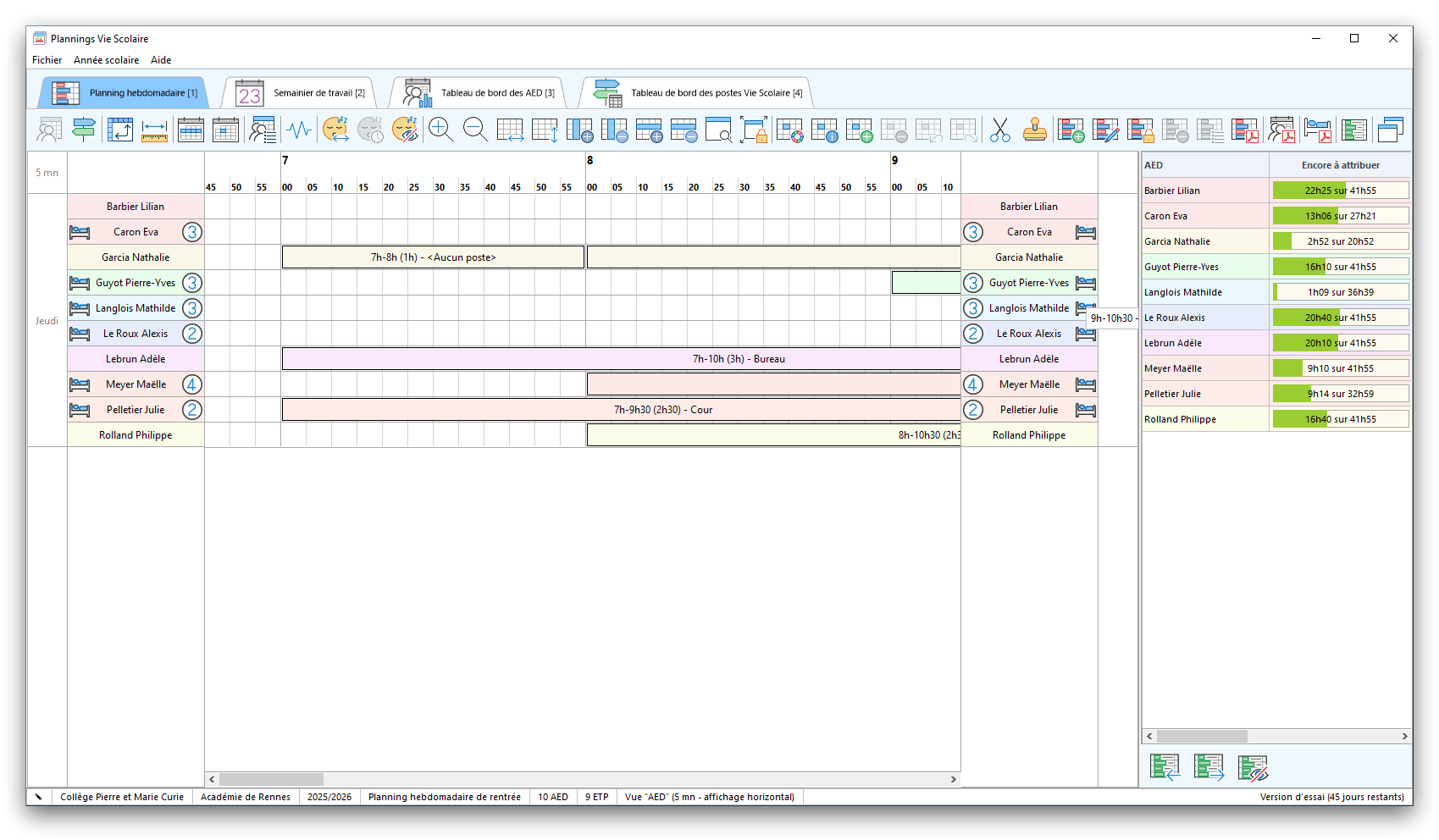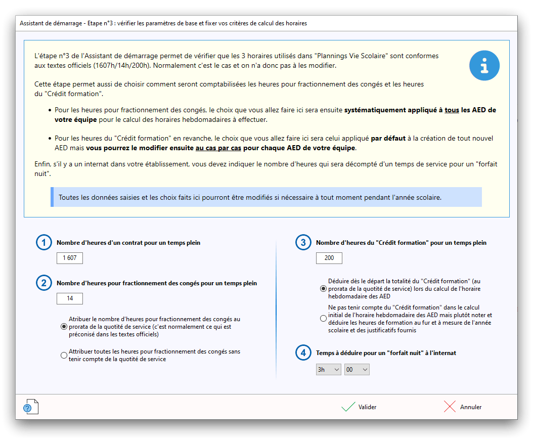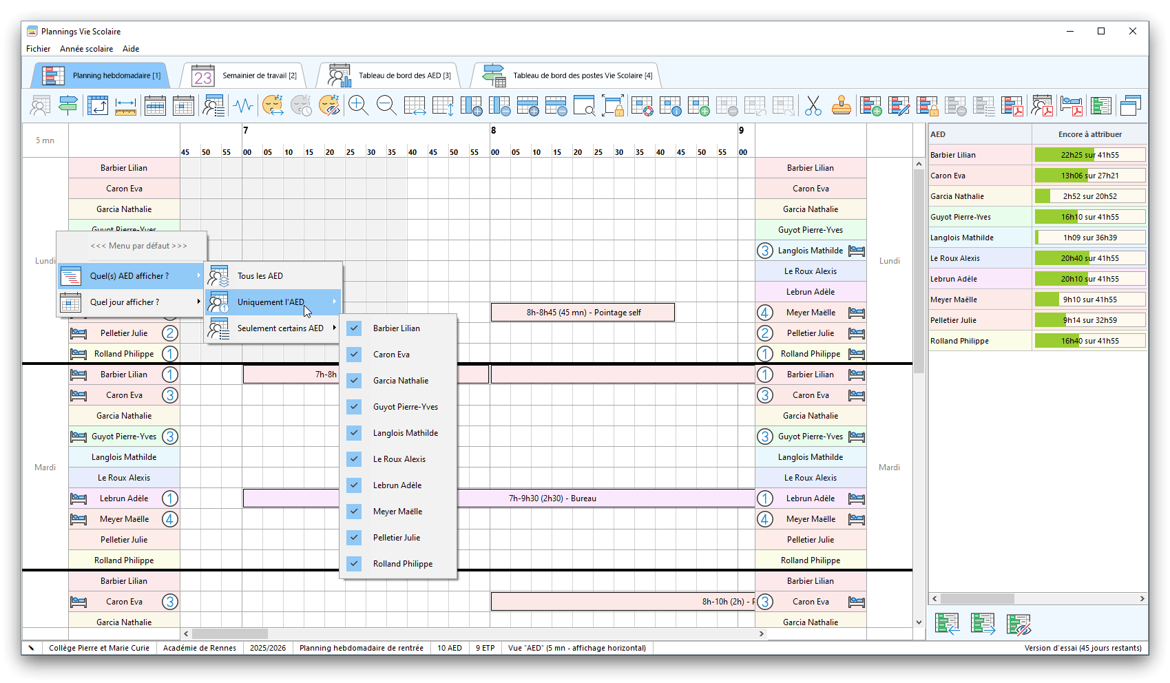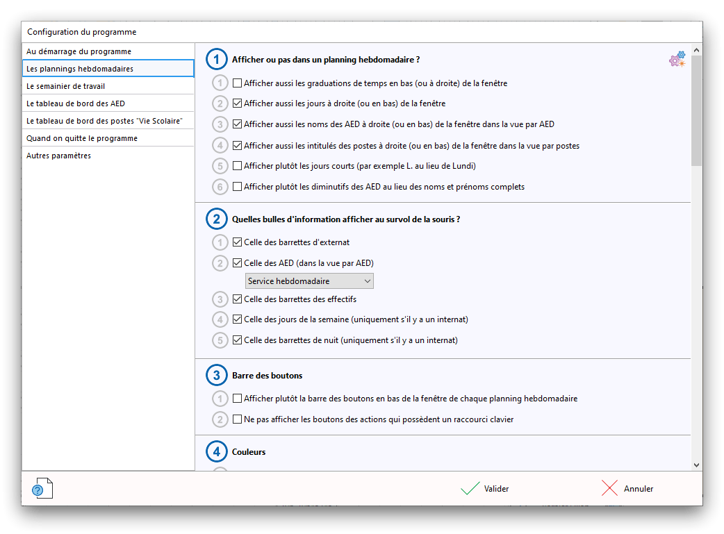 Premier démarrage de « Plannings Vie Scolaire »Créer et activer une clé d’essaiAssistant de démarrageAssistant de démarrage – Etape 1 – Choisir l’année scolaireAssistant de démarrage – Etape 2 – Définir vos plages horaires quotidiennes – Exemple d’organisation hebdomadaireAssistant de démarrage – Etape 3 – Vérifier les paramètres et fixer vos critères de calcul des horairesAssistant de démarrage – Etape 4 – Récupérer le calendrier scolaireAssistant de démarrage – Etape 5 – Créer votre liste de postes « Vie Scolaire »Liste des postes « Vie Scolaire » habituelsAssistant de démarrage – Etape 5 – Créer votre liste de postes « Vie Scolaire » – Liste complétéeAssistant de démarrage – Etape 6 – Créer votre équipe d’AEDAssistant de démarrage – Etape 6 – Créer votre équipe d’AED – Equipe fictiveCréer plusieurs AEDCréer un nouvel AEDAssistant de démarrage terminéOnglet 1 – Planning hebdomadaireUn planning hebdomadaireUn planning hebdomadaire en « Vue AED » – Affichage du panneau du résumé des servicesPlanning hebdomadaire – Menu contextuel sur un AEDPlanning hebdomadaire – Menu contextuel sur un jourPlanning hebdomadaire – Menu contextuel sur une cellule videPlanning hebdomadaire – Menu contextuel sur le panneau du résumé des servicesUn planning hebdomadaire en « Vue AED » – Affichage du nombre d’AED dans la journéeDans un planning hebdomadaire, choisir quel(s) AED afficher – Toute l’équipeDans un planning hebdomadaire, choisir quel(s) AED afficher – Une partie de l’équipeUn planning hebdomadaire en « Vue AED » – Affichage d’une partie de l’équipeUn planning hebdomadaire en « Vue AED » – Affichage d’un seul jourUn planning hebdomadaire en « Vue Poste » – Affichage horizontalUn planning hebdomadaire en « Vue Poste » – Affichage verticalUn planning hebdomadaire en « Vue AED » – Affichage verticalAjouter un nouveau planning hebdomadaireModifier les informations d’un planning hebdomadairePlanning hebdomadaire – Ajouter une ou plusieurs barrettesSimulateur d’horaire hebdomadaire théoriqueCalculateur de « réserve horaire »Voir votre organisation hebdomadaire actuelleOnglet 2 – Le semainier de travail n’est pas encore crééOnglet 2 – Le semainier de travailOnglet 2 – Le semainier de travail avec le panneau du résumé des services détailléLe semainier de travail avec une absenceSemainier de travail – Menu contextuel sur un AEDSemainier de travail – Menu contextuel sur une barrette existanteSemainier de travail – Menu contextuel sur le panneau du résumé des servicesSemainier de travail – Menu contextuel sur une barrette d’absenceSynthèse du temps de travail d’un AED sous forme de graphiqueSynthèse du temps de travail d’un AED sous forme de tableauAjouter un événement exceptionnel – ExempleAjouter une ouverture exceptionnelle – ExempleOnglet 3 – Tableau de bord des AEDTableau de bord des AED – Menu contextuelOnglet 4 – Tableau de bord des postes Vie ScolaireTableau de bord des postes Vie Scolaire – Menu contextuelCréer un poste « Vie Scolaire »Exporter la liste des postes « Vie Scolaire » au format texteExporter la liste des postes « Vie Scolaire » au format PDFExporter la liste des postes Vie Scolaire au format « Plannings Vie Scolaire »Les raccourcis clavier – Plannings hebdomadairesLes raccourcis clavier – Semainier de travailLes raccourcis clavier – Tableau de bord des AEDLes raccourcis clavier – Tableau de bord des postes Vie ScolaireOutils – Copier votre fichier de donnéesOutils – Récupérer un fichier de donnéesOutils – Restaurer un fichier de données sauvegardéCréer la fiche de poste des AED au format PDFExporter un planning hebdomadaire au format PDFExporter le bilan de l’internat au format PDFExporter un rapport d’activité au format PDFConfiguration – Au démarrage du programmeConfiguration – Les plannings hebdomadairesConfiguration – Le semainier de travailConfiguration – Tableau de bord des AEDConfiguration – Tableau de bord des postes « Vie Scolaire »Configuration – Quand on quitte le programmeConfiguration – Autres paramètresConseils et astuces d’utilisationInformations techniquesA propos de « Plannings Vie Scolaire »