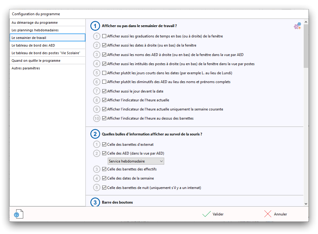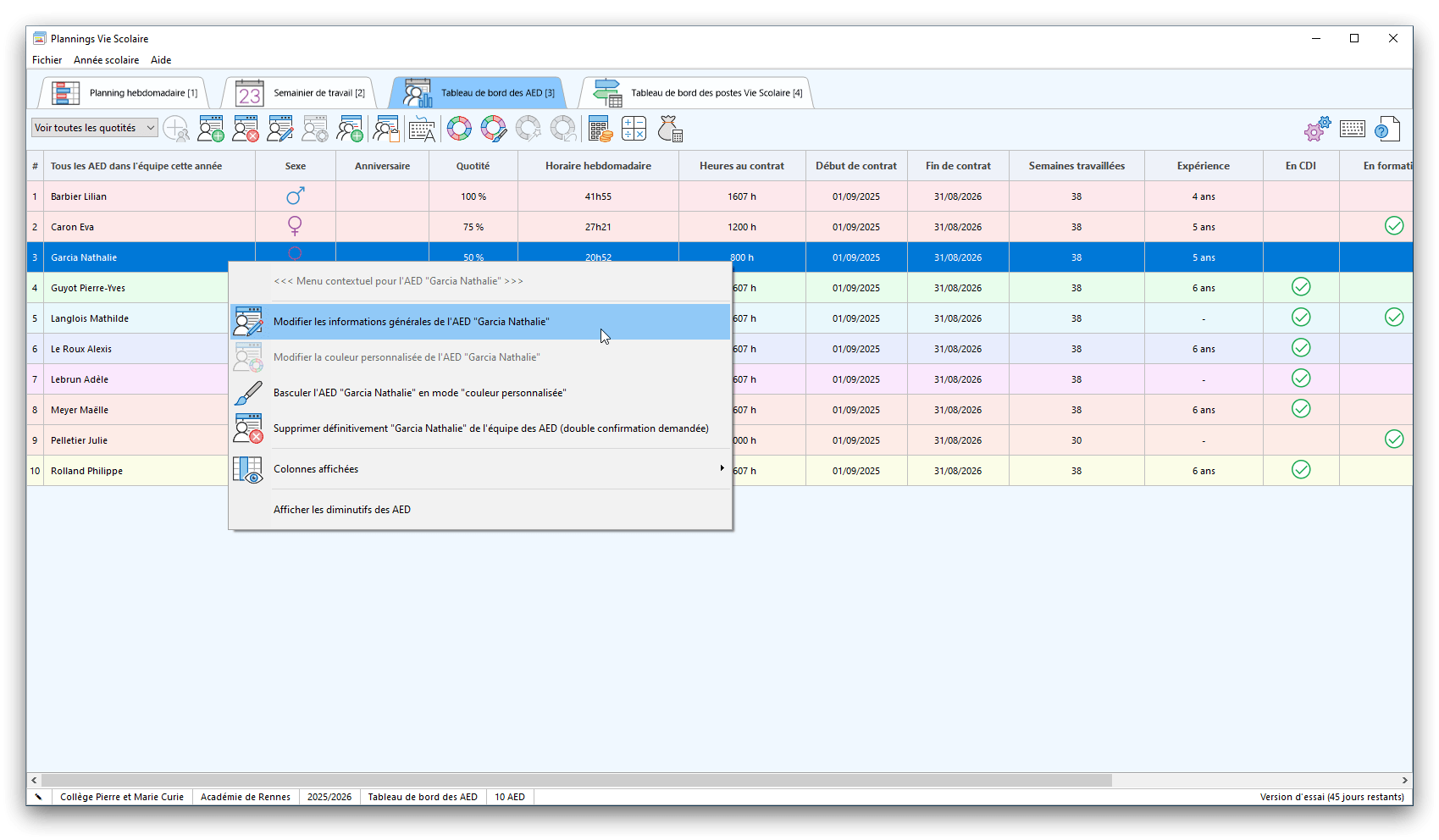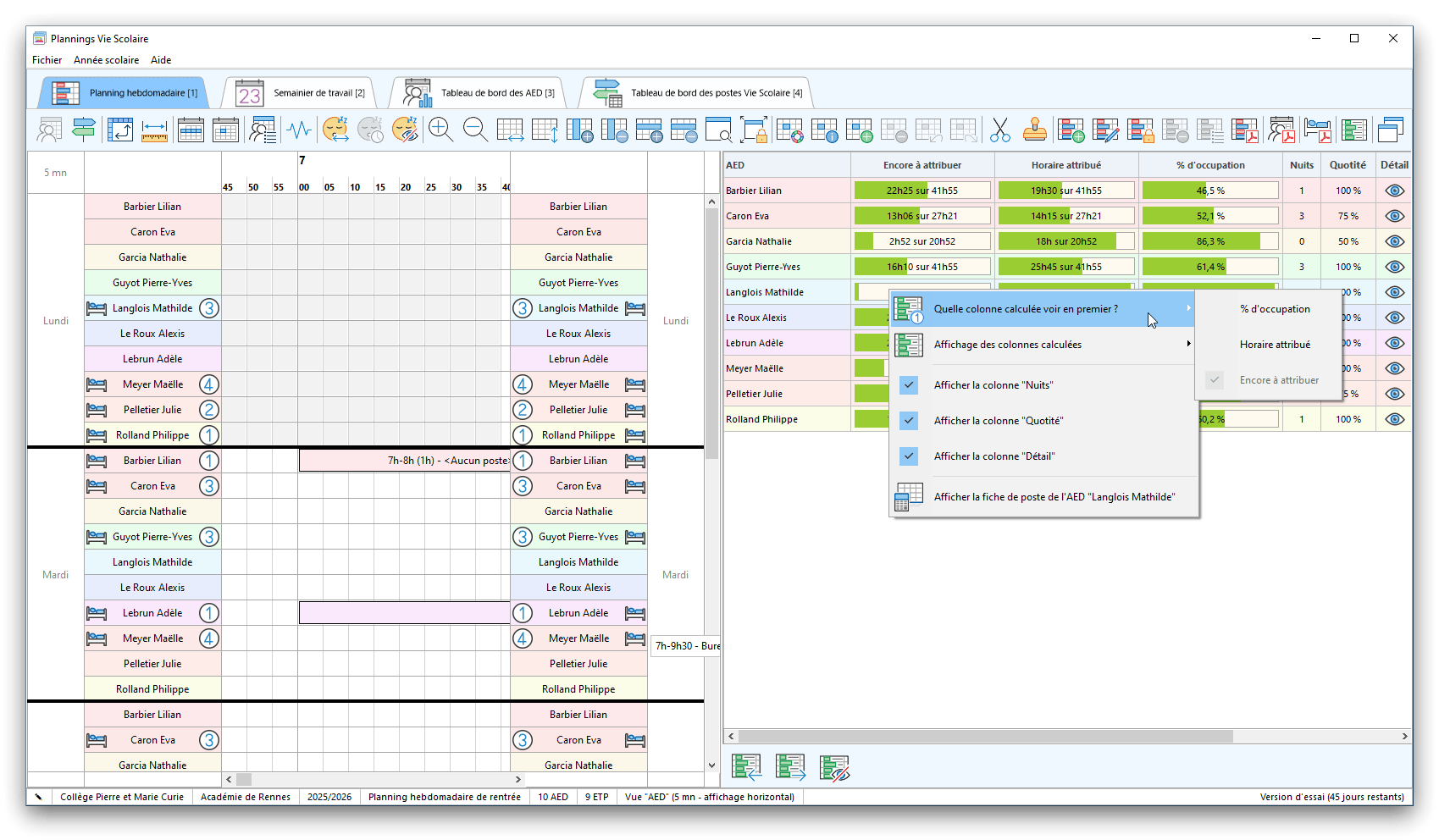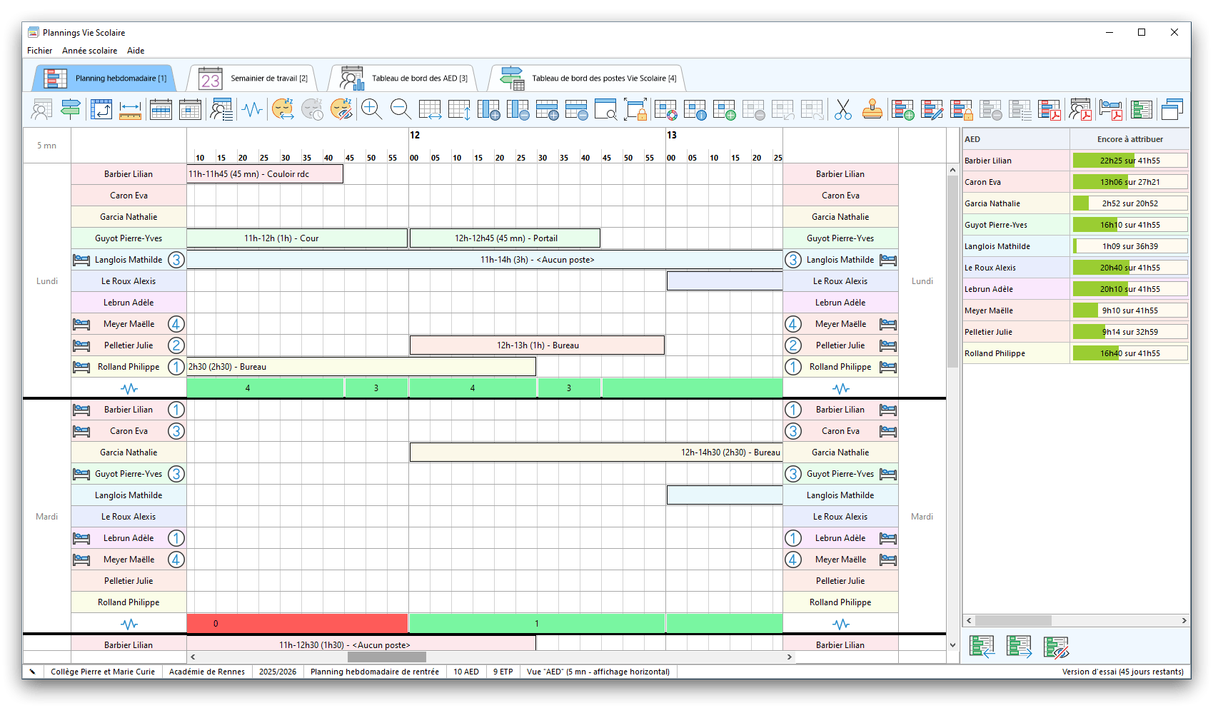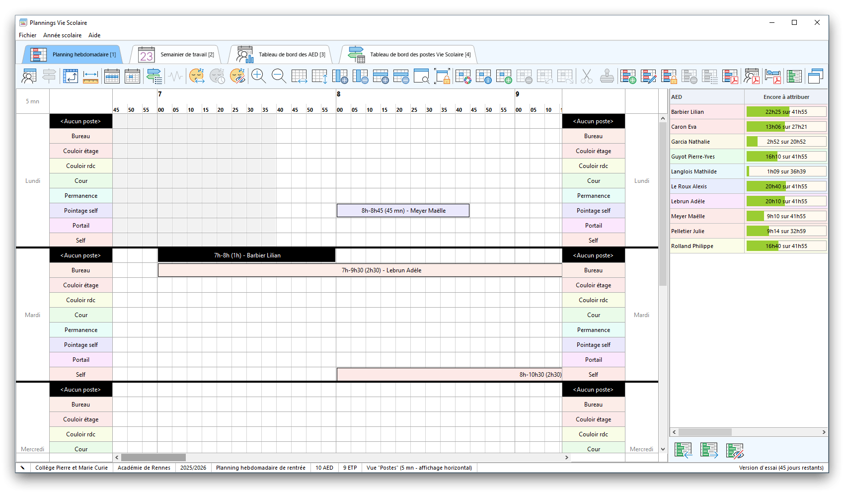 Premier démarrage de « Plannings Vie Scolaire »Créer et activer une clé d’essaiAssistant de démarrageAssistant de démarrage – Etape 1 – Choisir l’année scolaireAssistant de démarrage – Etape 2 – Définir vos plages horaires quotidiennes – Exemple d’organisation hebdomadaireAssistant de démarrage – Etape 3 – Vérifier les paramètres et fixer vos critères de calcul des horairesAssistant de démarrage – Etape 4 – Récupérer le calendrier scolaireAssistant de démarrage – Etape 5 – Créer votre liste de postes « Vie Scolaire »Liste des postes « Vie Scolaire » habituelsAssistant de démarrage – Etape 5 – Créer votre liste de postes « Vie Scolaire » – Liste complétéeAssistant de démarrage – Etape 6 – Créer votre équipe d’AEDAssistant de démarrage – Etape 6 – Créer votre équipe d’AED – Equipe fictiveCréer plusieurs AEDCréer un nouvel AEDAssistant de démarrage terminéOnglet 1 – Planning hebdomadaireUn planning hebdomadaireUn planning hebdomadaire en « Vue AED » – Affichage du panneau du résumé des servicesPlanning hebdomadaire – Menu contextuel sur un AEDPlanning hebdomadaire – Menu contextuel sur un jourPlanning hebdomadaire – Menu contextuel sur une cellule videPlanning hebdomadaire – Menu contextuel sur le panneau du résumé des servicesUn planning hebdomadaire en « Vue AED » – Affichage du nombre d’AED dans la journéeDans un planning hebdomadaire, choisir quel(s) AED afficher – Toute l’équipeDans un planning hebdomadaire, choisir quel(s) AED afficher – Une partie de l’équipeUn planning hebdomadaire en « Vue AED » – Affichage d’une partie de l’équipeUn planning hebdomadaire en « Vue AED » – Affichage d’un seul jourUn planning hebdomadaire en « Vue Poste » – Affichage horizontalUn planning hebdomadaire en « Vue Poste » – Affichage verticalUn planning hebdomadaire en « Vue AED » – Affichage verticalAjouter un nouveau planning hebdomadaireModifier les informations d’un planning hebdomadairePlanning hebdomadaire – Ajouter une ou plusieurs barrettesSimulateur d’horaire hebdomadaire théoriqueCalculateur de « réserve horaire »Voir votre organisation hebdomadaire actuelleOnglet 2 – Le semainier de travail n’est pas encore crééOnglet 2 – Le semainier de travailOnglet 2 – Le semainier de travail avec le panneau du résumé des services détailléLe semainier de travail avec une absenceSemainier de travail – Menu contextuel sur un AEDSemainier de travail – Menu contextuel sur une barrette existanteSemainier de travail – Menu contextuel sur le panneau du résumé des servicesSemainier de travail – Menu contextuel sur une barrette d’absenceSynthèse du temps de travail d’un AED sous forme de graphiqueSynthèse du temps de travail d’un AED sous forme de tableauAjouter un événement exceptionnel – ExempleAjouter une ouverture exceptionnelle – ExempleOnglet 3 – Tableau de bord des AEDTableau de bord des AED – Menu contextuelOnglet 4 – Tableau de bord des postes Vie ScolaireTableau de bord des postes Vie Scolaire – Menu contextuelCréer un poste « Vie Scolaire »Exporter la liste des postes « Vie Scolaire » au format texteExporter la liste des postes « Vie Scolaire » au format PDFExporter la liste des postes Vie Scolaire au format « Plannings Vie Scolaire »Les raccourcis clavier – Plannings hebdomadairesLes raccourcis clavier – Semainier de travailLes raccourcis clavier – Tableau de bord des AEDLes raccourcis clavier – Tableau de bord des postes Vie ScolaireOutils – Copier votre fichier de donnéesOutils – Récupérer un fichier de donnéesOutils – Restaurer un fichier de données sauvegardéCréer la fiche de poste des AED au format PDFExporter un planning hebdomadaire au format PDFExporter le bilan de l’internat au format PDFExporter un rapport d’activité au format PDFConfiguration – Au démarrage du programmeConfiguration – Les plannings hebdomadairesConfiguration – Le semainier de travailConfiguration – Tableau de bord des AEDConfiguration – Tableau de bord des postes « Vie Scolaire »Configuration – Quand on quitte le programmeConfiguration – Autres paramètresConseils et astuces d’utilisationInformations techniquesA propos de « Plannings Vie Scolaire »