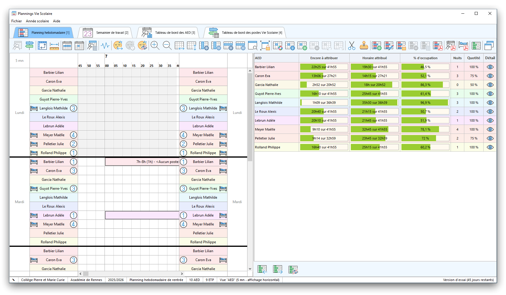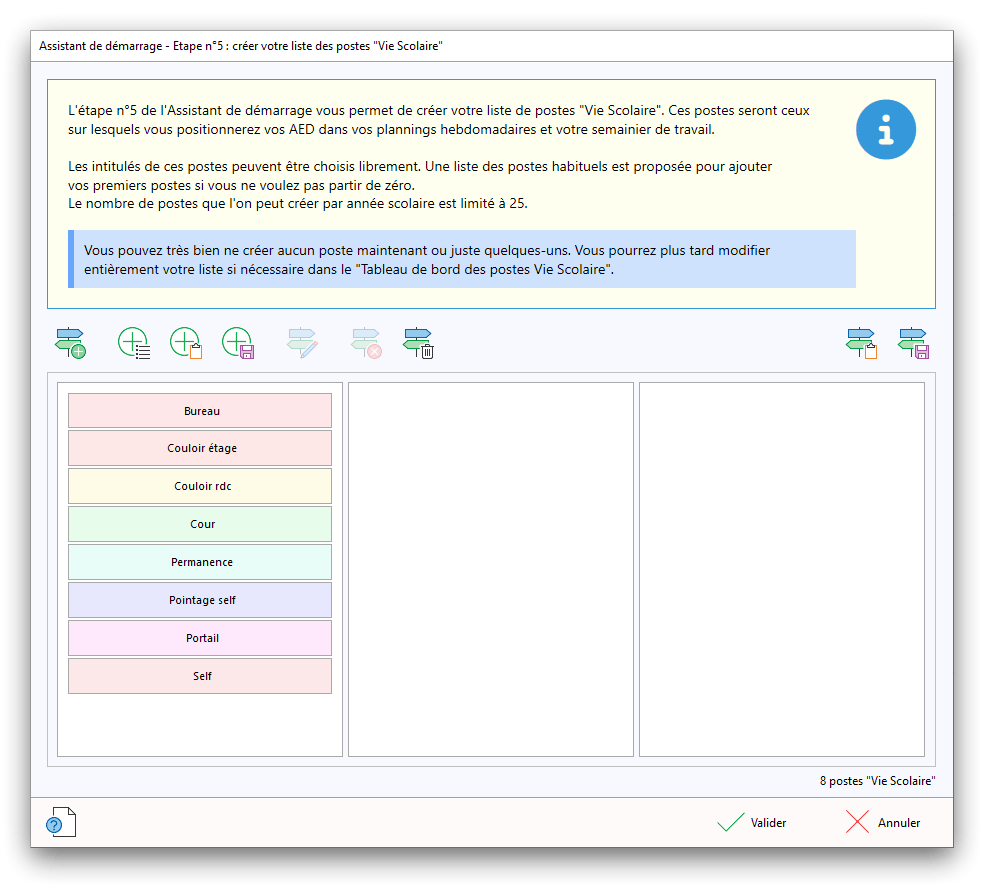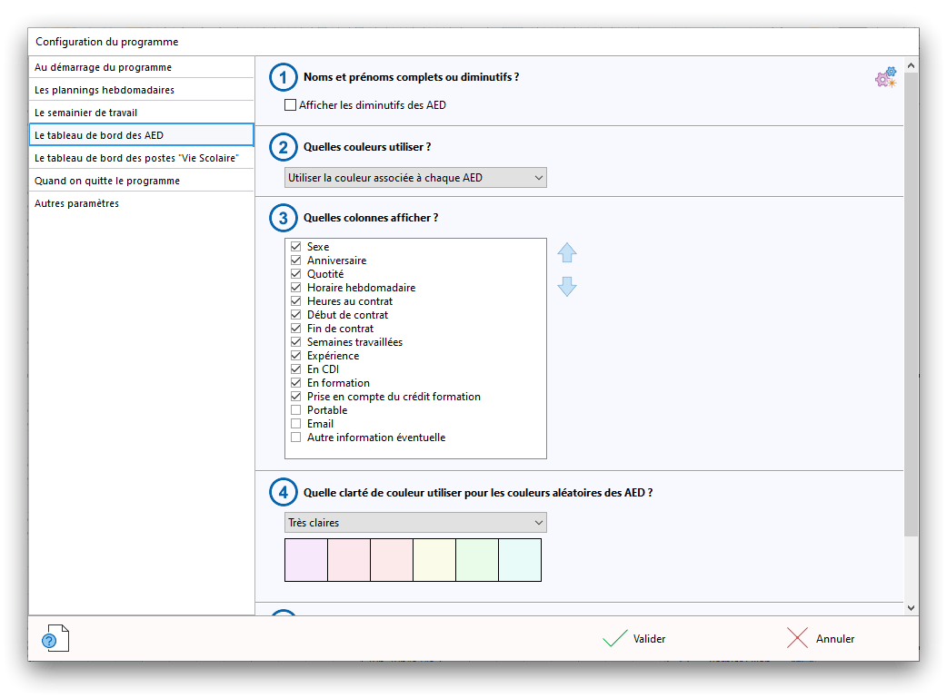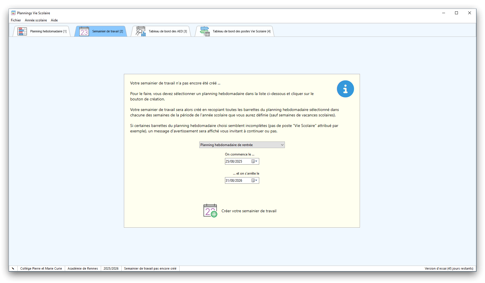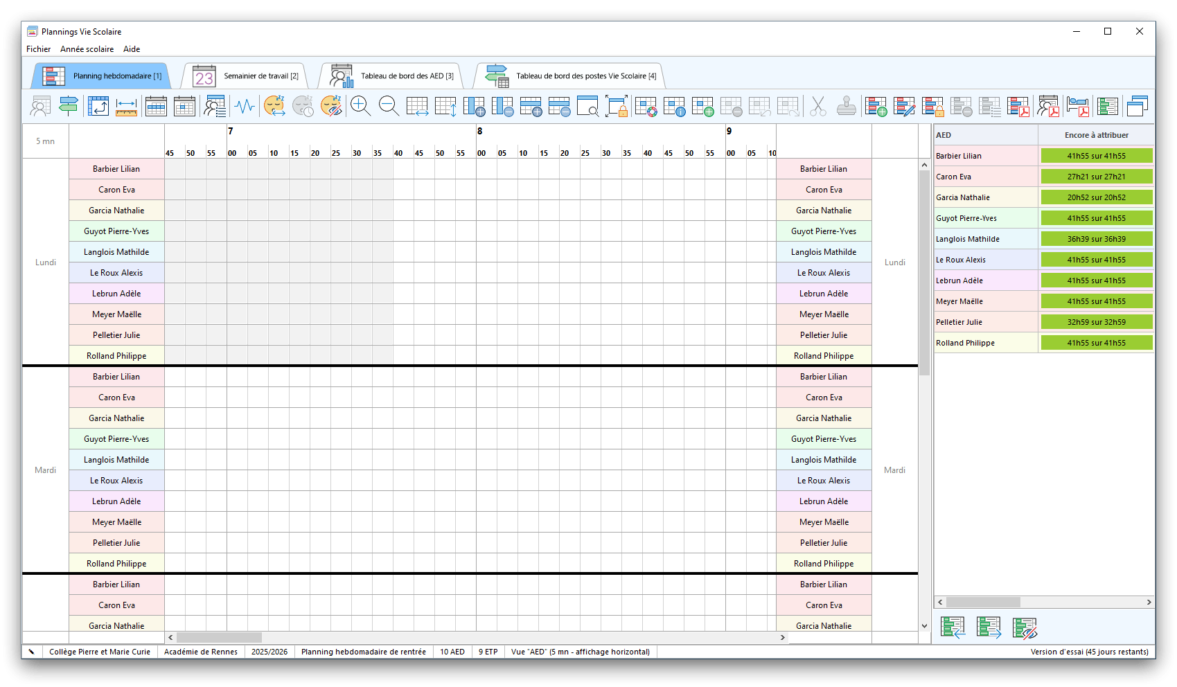 Premier démarrage de « Plannings Vie Scolaire »Créer et activer une clé d’essaiAssistant de démarrageAssistant de démarrage – Etape 1 – Choisir l’année scolaireAssistant de démarrage – Etape 2 – Définir vos plages horaires quotidiennes – Exemple d’organisation hebdomadaireAssistant de démarrage – Etape 3 – Vérifier les paramètres et fixer vos critères de calcul des horairesAssistant de démarrage – Etape 4 – Récupérer le calendrier scolaireAssistant de démarrage – Etape 5 – Créer votre liste de postes « Vie Scolaire »Liste des postes « Vie Scolaire » habituelsAssistant de démarrage – Etape 5 – Créer votre liste de postes « Vie Scolaire » – Liste complétéeAssistant de démarrage – Etape 6 – Créer votre équipe d’AEDAssistant de démarrage – Etape 6 – Créer votre équipe d’AED – Equipe fictiveCréer plusieurs AEDCréer un nouvel AEDAssistant de démarrage terminéOnglet 1 – Planning hebdomadaireUn planning hebdomadaireUn planning hebdomadaire en « Vue AED » – Affichage du panneau du résumé des servicesPlanning hebdomadaire – Menu contextuel sur un AEDPlanning hebdomadaire – Menu contextuel sur un jourPlanning hebdomadaire – Menu contextuel sur une cellule videPlanning hebdomadaire – Menu contextuel sur le panneau du résumé des servicesUn planning hebdomadaire en « Vue AED » – Affichage du nombre d’AED dans la journéeDans un planning hebdomadaire, choisir quel(s) AED afficher – Toute l’équipeDans un planning hebdomadaire, choisir quel(s) AED afficher – Une partie de l’équipeUn planning hebdomadaire en « Vue AED » – Affichage d’une partie de l’équipeUn planning hebdomadaire en « Vue AED » – Affichage d’un seul jourUn planning hebdomadaire en « Vue Poste » – Affichage horizontalUn planning hebdomadaire en « Vue Poste » – Affichage verticalUn planning hebdomadaire en « Vue AED » – Affichage verticalAjouter un nouveau planning hebdomadaireModifier les informations d’un planning hebdomadairePlanning hebdomadaire – Ajouter une ou plusieurs barrettesSimulateur d’horaire hebdomadaire théoriqueCalculateur de « réserve horaire »Voir votre organisation hebdomadaire actuelleOnglet 2 – Le semainier de travail n’est pas encore crééOnglet 2 – Le semainier de travailOnglet 2 – Le semainier de travail avec le panneau du résumé des services détailléLe semainier de travail avec une absenceSemainier de travail – Menu contextuel sur un AEDSemainier de travail – Menu contextuel sur une barrette existanteSemainier de travail – Menu contextuel sur le panneau du résumé des servicesSemainier de travail – Menu contextuel sur une barrette d’absenceSynthèse du temps de travail d’un AED sous forme de graphiqueSynthèse du temps de travail d’un AED sous forme de tableauAjouter un événement exceptionnel – ExempleAjouter une ouverture exceptionnelle – ExempleOnglet 3 – Tableau de bord des AEDTableau de bord des AED – Menu contextuelOnglet 4 – Tableau de bord des postes Vie ScolaireTableau de bord des postes Vie Scolaire – Menu contextuelCréer un poste « Vie Scolaire »Exporter la liste des postes « Vie Scolaire » au format texteExporter la liste des postes « Vie Scolaire » au format PDFExporter la liste des postes Vie Scolaire au format « Plannings Vie Scolaire »Les raccourcis clavier – Plannings hebdomadairesLes raccourcis clavier – Semainier de travailLes raccourcis clavier – Tableau de bord des AEDLes raccourcis clavier – Tableau de bord des postes Vie ScolaireOutils – Copier votre fichier de donnéesOutils – Récupérer un fichier de donnéesOutils – Restaurer un fichier de données sauvegardéCréer la fiche de poste des AED au format PDFExporter un planning hebdomadaire au format PDFExporter le bilan de l’internat au format PDFExporter un rapport d’activité au format PDFConfiguration – Au démarrage du programmeConfiguration – Les plannings hebdomadairesConfiguration – Le semainier de travailConfiguration – Tableau de bord des AEDConfiguration – Tableau de bord des postes « Vie Scolaire »Configuration – Quand on quitte le programmeConfiguration – Autres paramètresConseils et astuces d’utilisationInformations techniquesA propos de « Plannings Vie Scolaire »