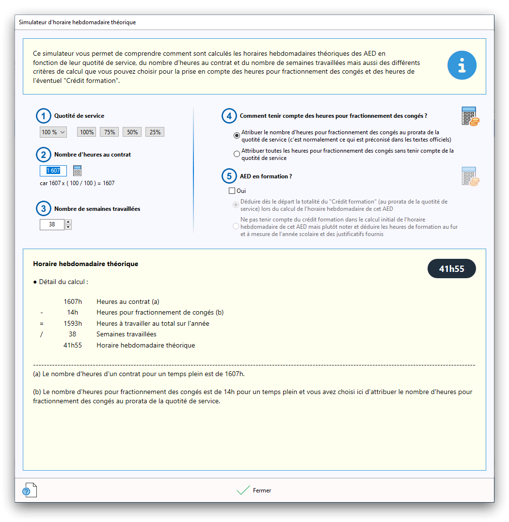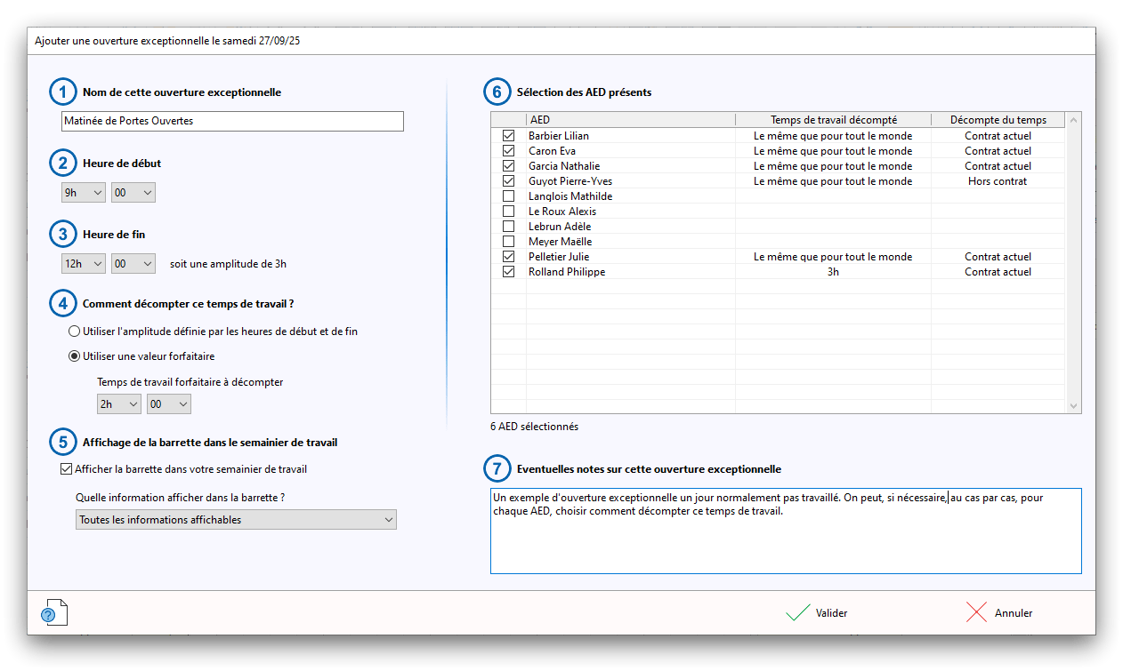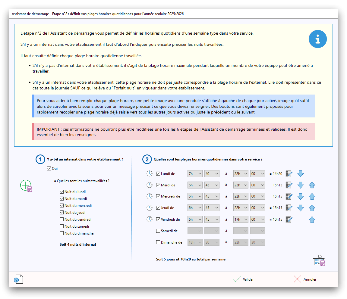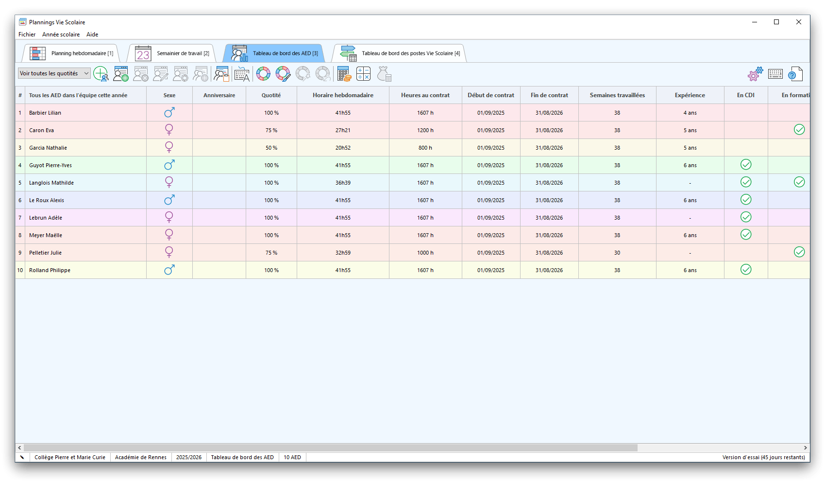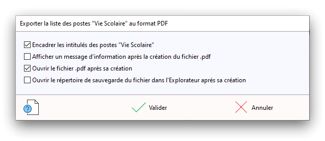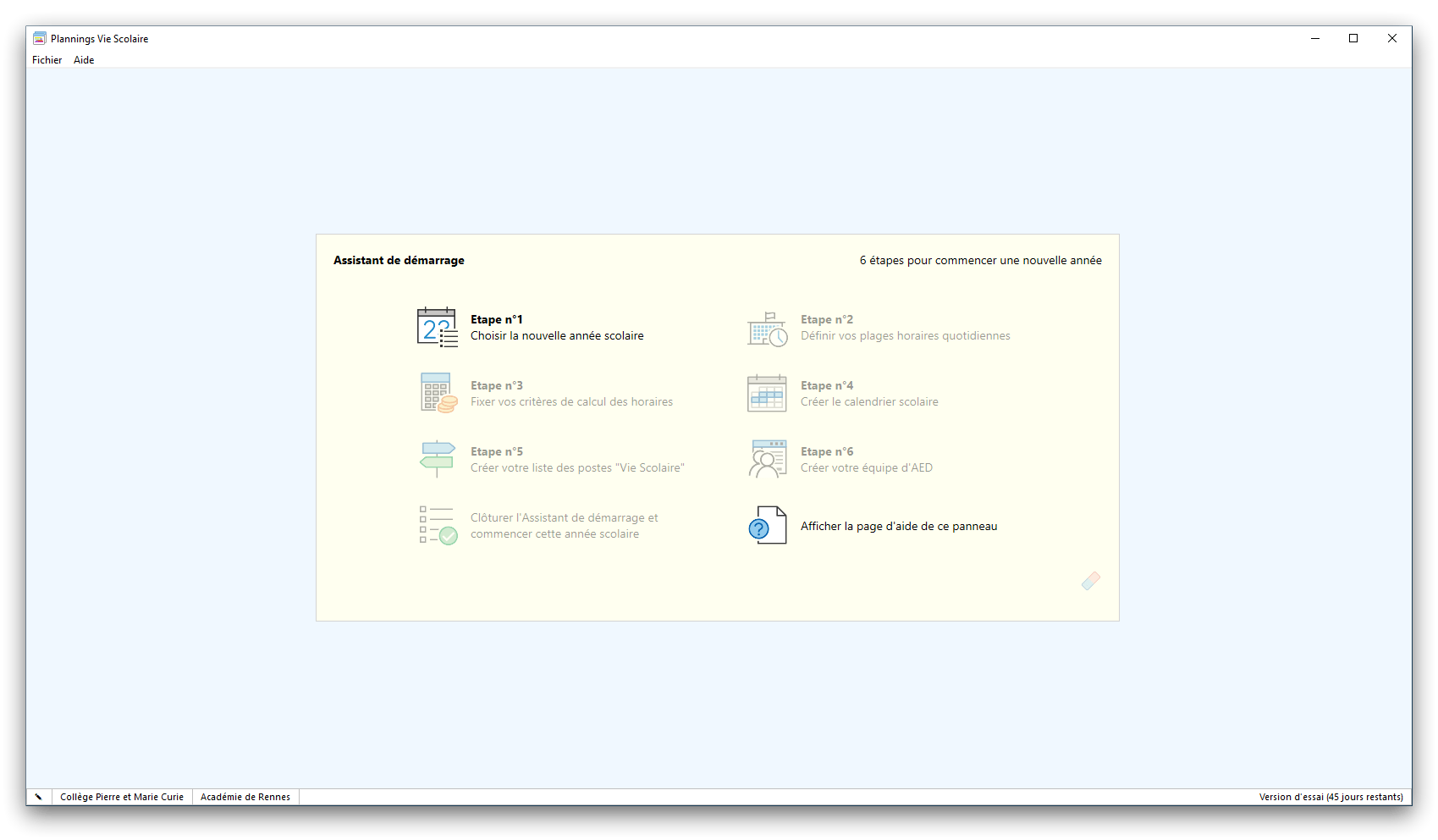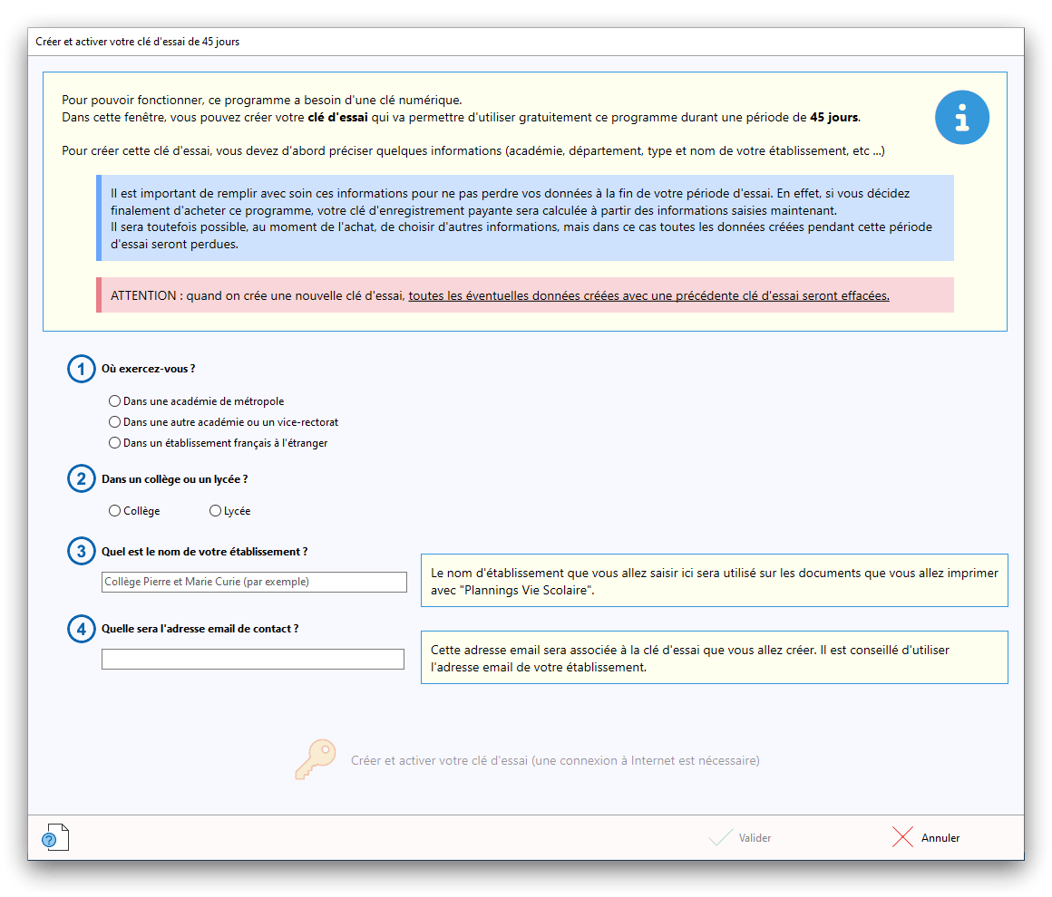 Premier démarrage de « Plannings Vie Scolaire »Créer et activer une clé d’essaiAssistant de démarrageAssistant de démarrage – Etape 1 – Choisir l’année scolaireAssistant de démarrage – Etape 2 – Définir vos plages horaires quotidiennes – Exemple d’organisation hebdomadaireAssistant de démarrage – Etape 3 – Vérifier les paramètres et fixer vos critères de calcul des horairesAssistant de démarrage – Etape 4 – Récupérer le calendrier scolaireAssistant de démarrage – Etape 5 – Créer votre liste de postes « Vie Scolaire »Liste des postes « Vie Scolaire » habituelsAssistant de démarrage – Etape 5 – Créer votre liste de postes « Vie Scolaire » – Liste complétéeAssistant de démarrage – Etape 6 – Créer votre équipe d’AEDAssistant de démarrage – Etape 6 – Créer votre équipe d’AED – Equipe fictiveCréer plusieurs AEDCréer un nouvel AEDAssistant de démarrage terminéOnglet 1 – Planning hebdomadaireUn planning hebdomadaireUn planning hebdomadaire en « Vue AED » – Affichage du panneau du résumé des servicesPlanning hebdomadaire – Menu contextuel sur un AEDPlanning hebdomadaire – Menu contextuel sur un jourPlanning hebdomadaire – Menu contextuel sur une cellule videPlanning hebdomadaire – Menu contextuel sur le panneau du résumé des servicesUn planning hebdomadaire en « Vue AED » – Affichage du nombre d’AED dans la journéeDans un planning hebdomadaire, choisir quel(s) AED afficher – Toute l’équipeDans un planning hebdomadaire, choisir quel(s) AED afficher – Une partie de l’équipeUn planning hebdomadaire en « Vue AED » – Affichage d’une partie de l’équipeUn planning hebdomadaire en « Vue AED » – Affichage d’un seul jourUn planning hebdomadaire en « Vue Poste » – Affichage horizontalUn planning hebdomadaire en « Vue Poste » – Affichage verticalUn planning hebdomadaire en « Vue AED » – Affichage verticalAjouter un nouveau planning hebdomadaireModifier les informations d’un planning hebdomadairePlanning hebdomadaire – Ajouter une ou plusieurs barrettesSimulateur d’horaire hebdomadaire théoriqueCalculateur de « réserve horaire »Voir votre organisation hebdomadaire actuelleOnglet 2 – Le semainier de travail n’est pas encore crééOnglet 2 – Le semainier de travailOnglet 2 – Le semainier de travail avec le panneau du résumé des services détailléLe semainier de travail avec une absenceSemainier de travail – Menu contextuel sur un AEDSemainier de travail – Menu contextuel sur une barrette existanteSemainier de travail – Menu contextuel sur le panneau du résumé des servicesSemainier de travail – Menu contextuel sur une barrette d’absenceSynthèse du temps de travail d’un AED sous forme de graphiqueSynthèse du temps de travail d’un AED sous forme de tableauAjouter un événement exceptionnel – ExempleAjouter une ouverture exceptionnelle – ExempleOnglet 3 – Tableau de bord des AEDTableau de bord des AED – Menu contextuelOnglet 4 – Tableau de bord des postes Vie ScolaireTableau de bord des postes Vie Scolaire – Menu contextuelCréer un poste « Vie Scolaire »Exporter la liste des postes « Vie Scolaire » au format texteExporter la liste des postes « Vie Scolaire » au format PDFExporter la liste des postes Vie Scolaire au format « Plannings Vie Scolaire »Les raccourcis clavier – Plannings hebdomadairesLes raccourcis clavier – Semainier de travailLes raccourcis clavier – Tableau de bord des AEDLes raccourcis clavier – Tableau de bord des postes Vie ScolaireOutils – Copier votre fichier de donnéesOutils – Récupérer un fichier de donnéesOutils – Restaurer un fichier de données sauvegardéCréer la fiche de poste des AED au format PDFExporter un planning hebdomadaire au format PDFExporter le bilan de l’internat au format PDFExporter un rapport d’activité au format PDFConfiguration – Au démarrage du programmeConfiguration – Les plannings hebdomadairesConfiguration – Le semainier de travailConfiguration – Tableau de bord des AEDConfiguration – Tableau de bord des postes « Vie Scolaire »Configuration – Quand on quitte le programmeConfiguration – Autres paramètresConseils et astuces d’utilisationInformations techniquesA propos de « Plannings Vie Scolaire »