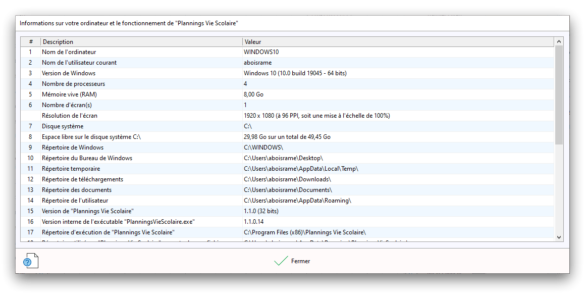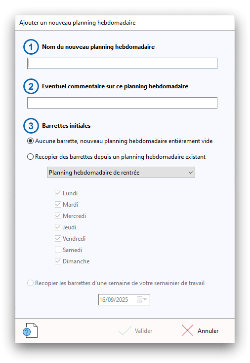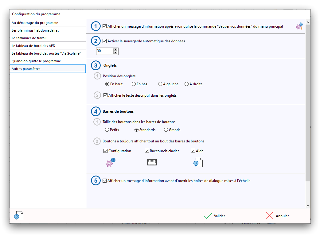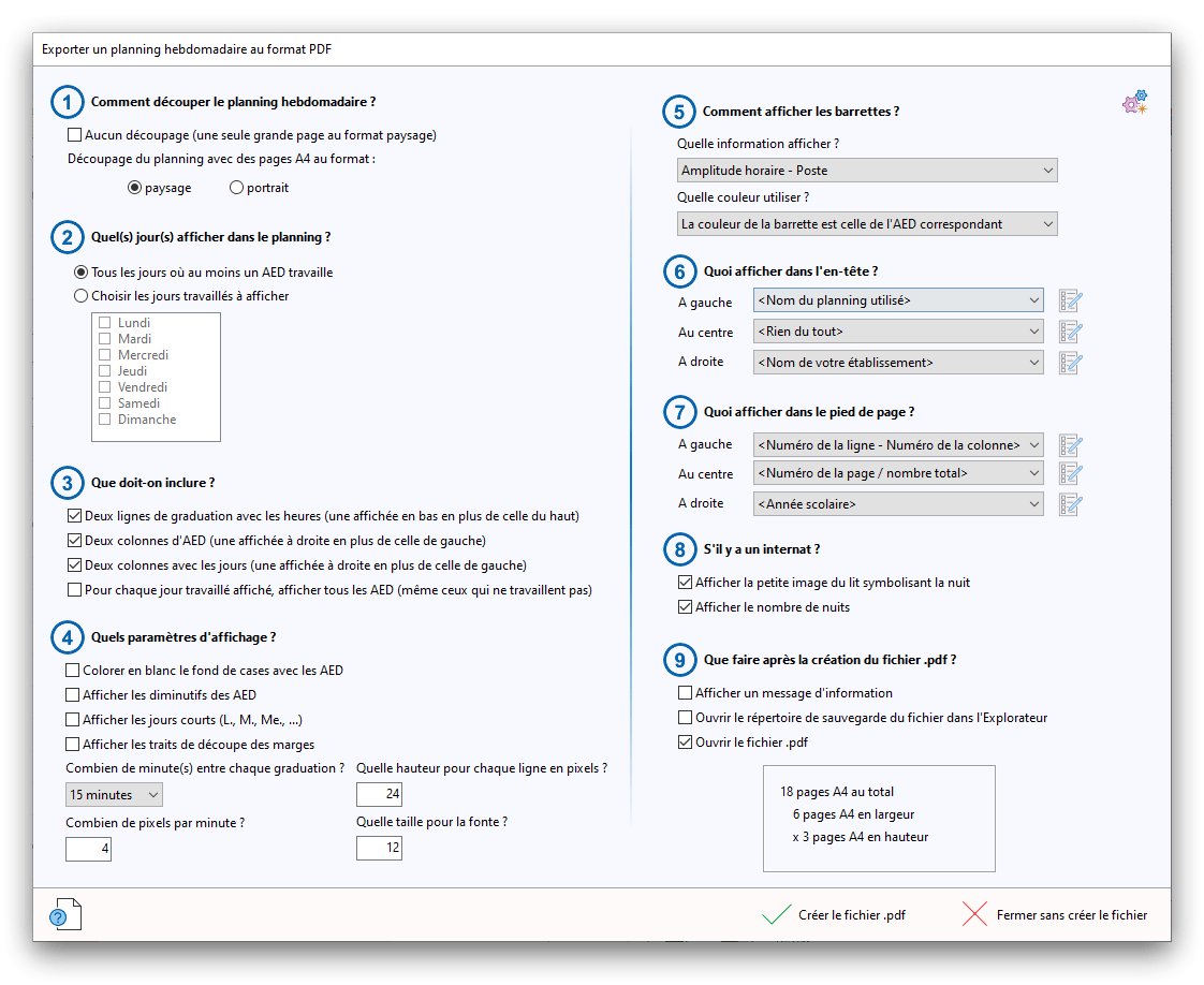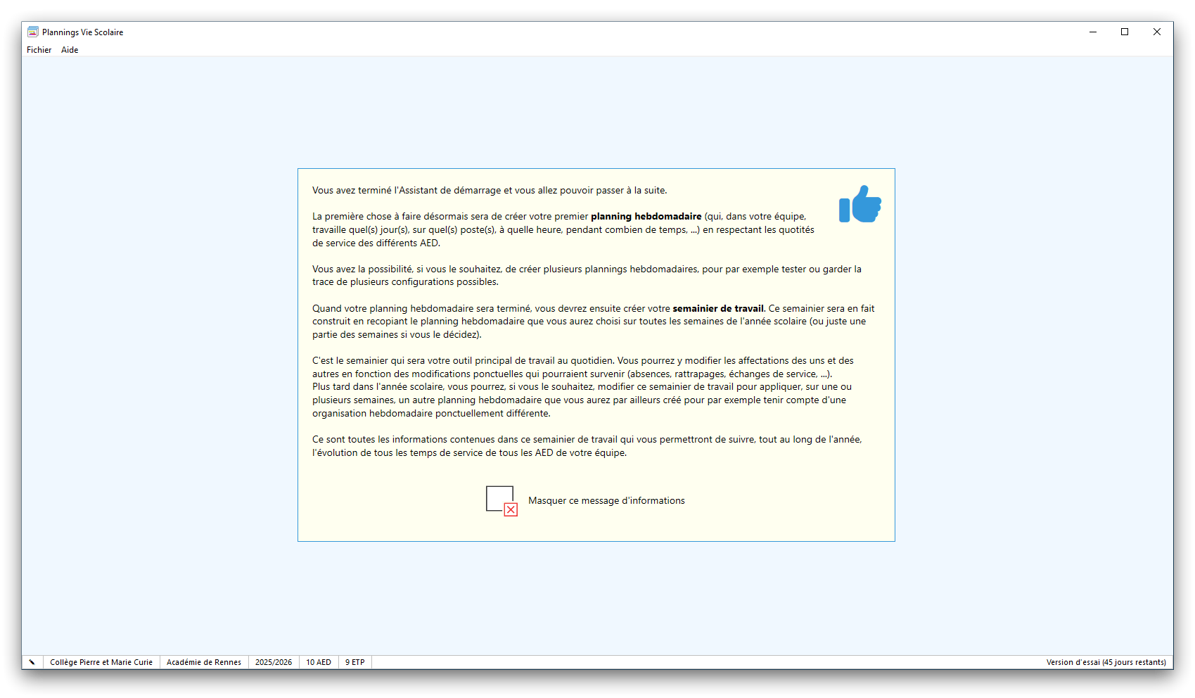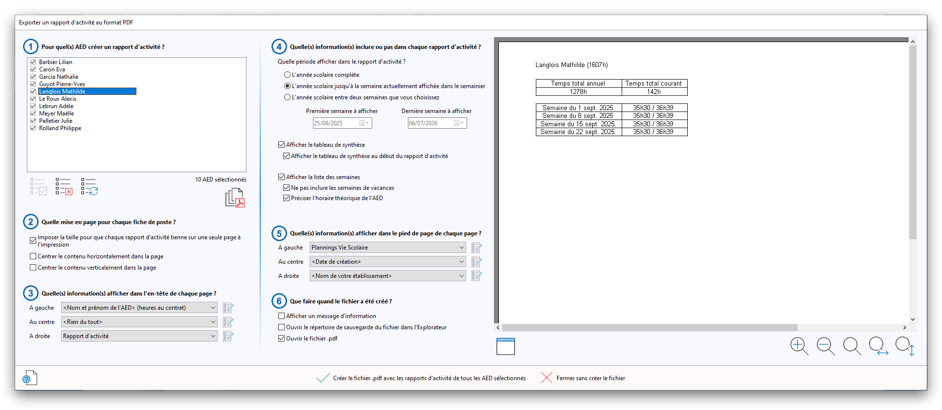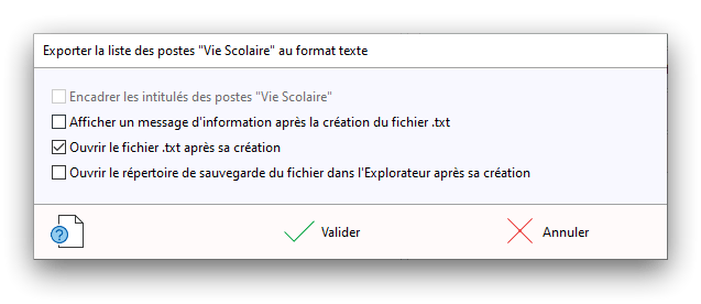 Premier démarrage de « Plannings Vie Scolaire »Créer et activer une clé d’essaiAssistant de démarrageAssistant de démarrage – Etape 1 – Choisir l’année scolaireAssistant de démarrage – Etape 2 – Définir vos plages horaires quotidiennes – Exemple d’organisation hebdomadaireAssistant de démarrage – Etape 3 – Vérifier les paramètres et fixer vos critères de calcul des horairesAssistant de démarrage – Etape 4 – Récupérer le calendrier scolaireAssistant de démarrage – Etape 5 – Créer votre liste de postes « Vie Scolaire »Liste des postes « Vie Scolaire » habituelsAssistant de démarrage – Etape 5 – Créer votre liste de postes « Vie Scolaire » – Liste complétéeAssistant de démarrage – Etape 6 – Créer votre équipe d’AEDAssistant de démarrage – Etape 6 – Créer votre équipe d’AED – Equipe fictiveCréer plusieurs AEDCréer un nouvel AEDAssistant de démarrage terminéOnglet 1 – Planning hebdomadaireUn planning hebdomadaireUn planning hebdomadaire en « Vue AED » – Affichage du panneau du résumé des servicesPlanning hebdomadaire – Menu contextuel sur un AEDPlanning hebdomadaire – Menu contextuel sur un jourPlanning hebdomadaire – Menu contextuel sur une cellule videPlanning hebdomadaire – Menu contextuel sur le panneau du résumé des servicesUn planning hebdomadaire en « Vue AED » – Affichage du nombre d’AED dans la journéeDans un planning hebdomadaire, choisir quel(s) AED afficher – Toute l’équipeDans un planning hebdomadaire, choisir quel(s) AED afficher – Une partie de l’équipeUn planning hebdomadaire en « Vue AED » – Affichage d’une partie de l’équipeUn planning hebdomadaire en « Vue AED » – Affichage d’un seul jourUn planning hebdomadaire en « Vue Poste » – Affichage horizontalUn planning hebdomadaire en « Vue Poste » – Affichage verticalUn planning hebdomadaire en « Vue AED » – Affichage verticalAjouter un nouveau planning hebdomadaireModifier les informations d’un planning hebdomadairePlanning hebdomadaire – Ajouter une ou plusieurs barrettesSimulateur d’horaire hebdomadaire théoriqueCalculateur de « réserve horaire »Voir votre organisation hebdomadaire actuelleOnglet 2 – Le semainier de travail n’est pas encore crééOnglet 2 – Le semainier de travailOnglet 2 – Le semainier de travail avec le panneau du résumé des services détailléLe semainier de travail avec une absenceSemainier de travail – Menu contextuel sur un AEDSemainier de travail – Menu contextuel sur une barrette existanteSemainier de travail – Menu contextuel sur le panneau du résumé des servicesSemainier de travail – Menu contextuel sur une barrette d’absenceSynthèse du temps de travail d’un AED sous forme de graphiqueSynthèse du temps de travail d’un AED sous forme de tableauAjouter un événement exceptionnel – ExempleAjouter une ouverture exceptionnelle – ExempleOnglet 3 – Tableau de bord des AEDTableau de bord des AED – Menu contextuelOnglet 4 – Tableau de bord des postes Vie ScolaireTableau de bord des postes Vie Scolaire – Menu contextuelCréer un poste « Vie Scolaire »Exporter la liste des postes « Vie Scolaire » au format texteExporter la liste des postes « Vie Scolaire » au format PDFExporter la liste des postes Vie Scolaire au format « Plannings Vie Scolaire »Les raccourcis clavier – Plannings hebdomadairesLes raccourcis clavier – Semainier de travailLes raccourcis clavier – Tableau de bord des AEDLes raccourcis clavier – Tableau de bord des postes Vie ScolaireOutils – Copier votre fichier de donnéesOutils – Récupérer un fichier de donnéesOutils – Restaurer un fichier de données sauvegardéCréer la fiche de poste des AED au format PDFExporter un planning hebdomadaire au format PDFExporter le bilan de l’internat au format PDFExporter un rapport d’activité au format PDFConfiguration – Au démarrage du programmeConfiguration – Les plannings hebdomadairesConfiguration – Le semainier de travailConfiguration – Tableau de bord des AEDConfiguration – Tableau de bord des postes « Vie Scolaire »Configuration – Quand on quitte le programmeConfiguration – Autres paramètresConseils et astuces d’utilisationInformations techniquesA propos de « Plannings Vie Scolaire »